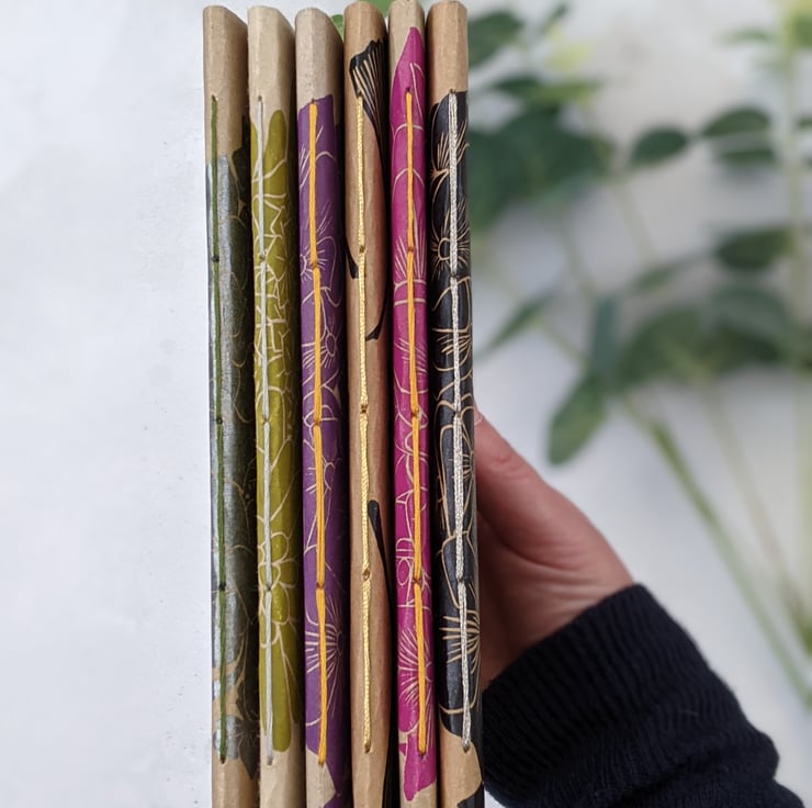 When I'm testing a print there is always wastage, and I really hate wasting paper. So what better way to use up these prints than making some lovely hand stitched notebooks with them. All the designs are based on flowers I like or leaves I have collected on my walks in nature.