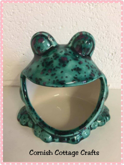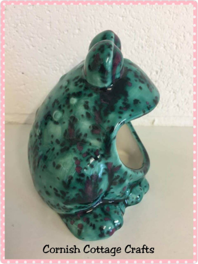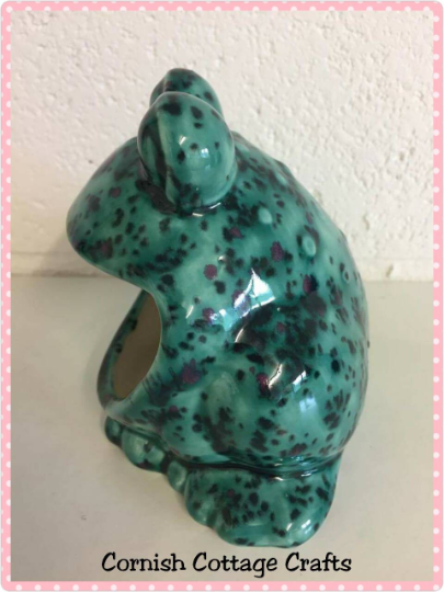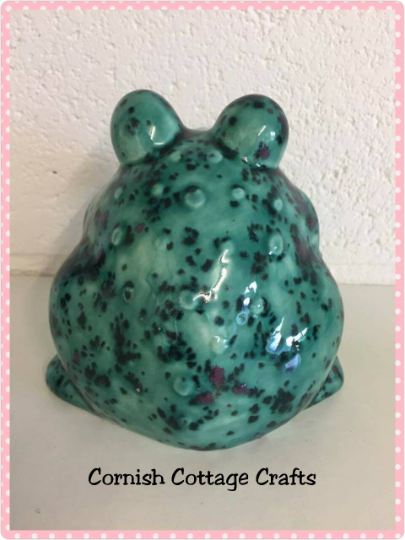 The frog is painted in a crystal glaze and has been fired in my kiln. It is dishwasher safe.