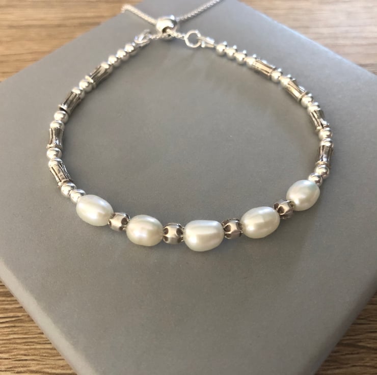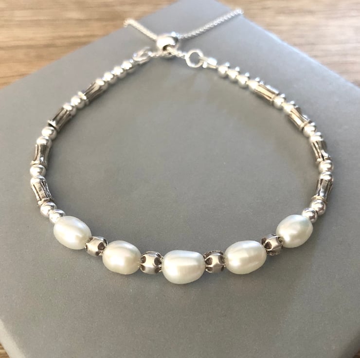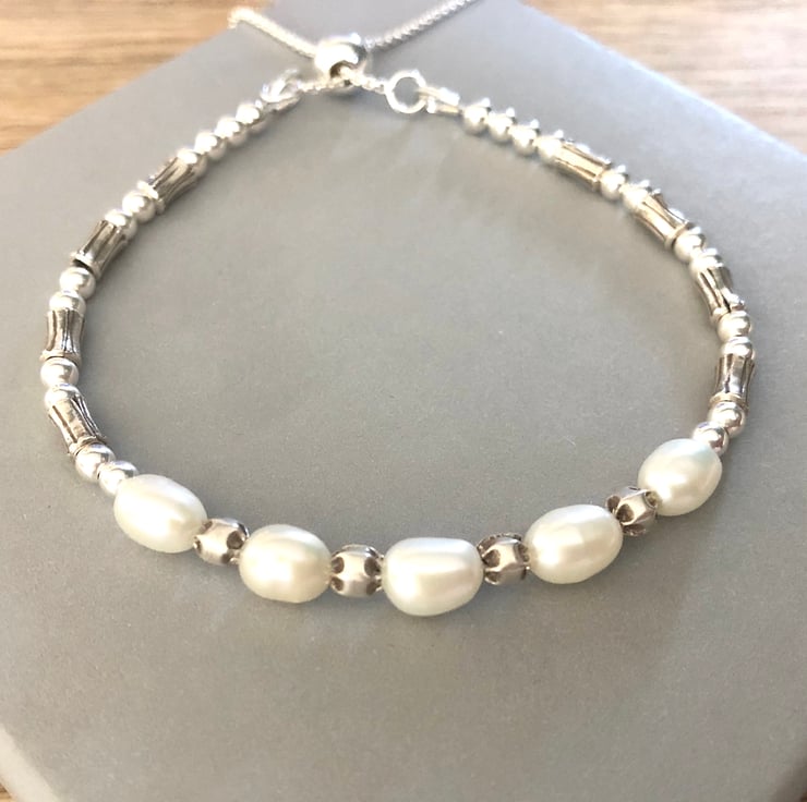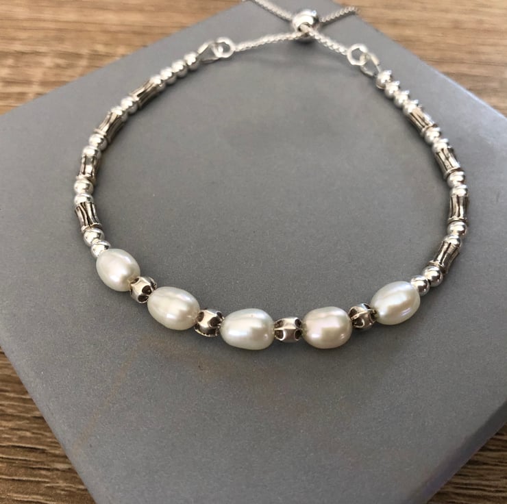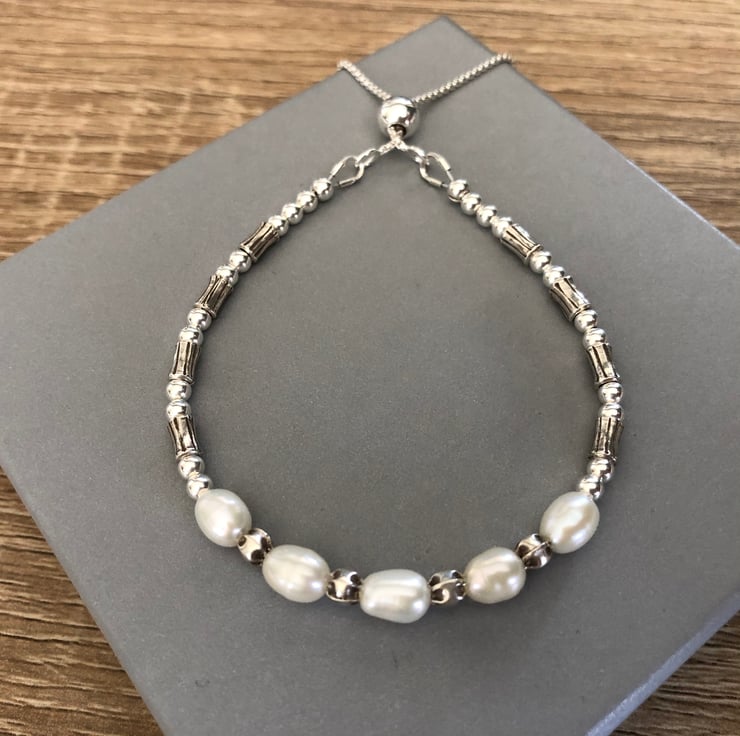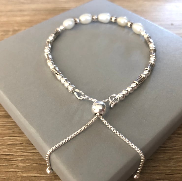 Sterling Silver White Pearl Adjustable Slider Clasp Friendship Bracelet -The bracelet was made with genuine white Freshwater Pearls and Sterling Silver beads and finished with a Fully adjustable Sterling Silver slider clasp.