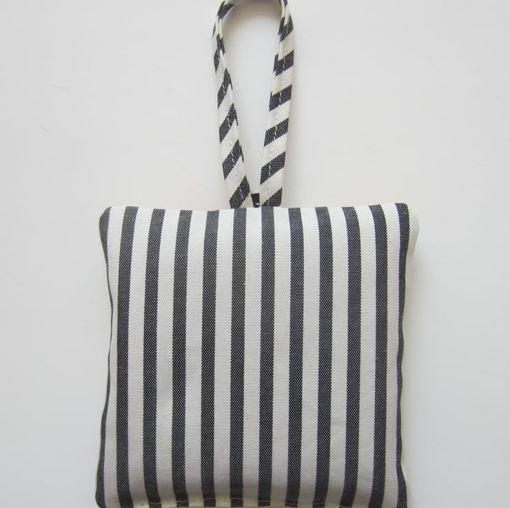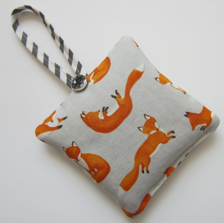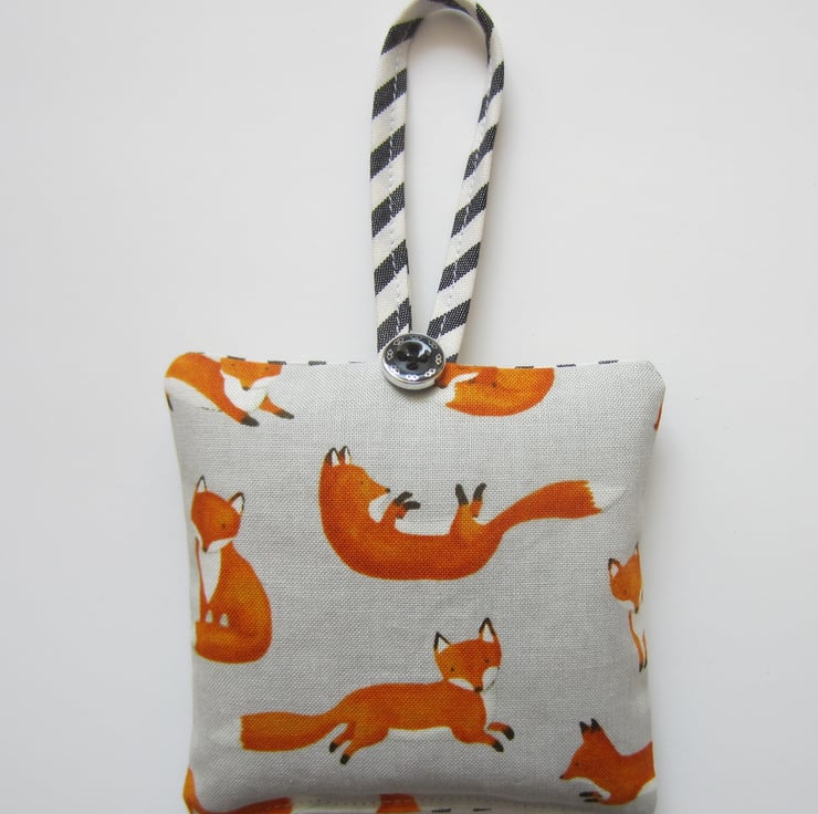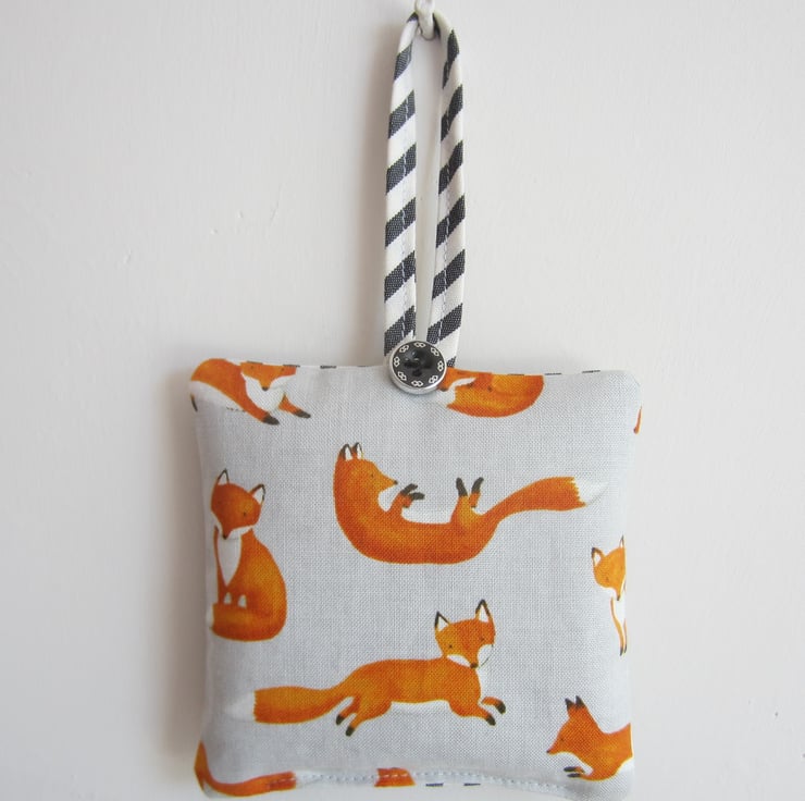 Lavender sachet made from a fabric featuring foxes on a pale grey background and decorated with a black and silver coloured button. It is backed with a grey and white striped fabric and hangs with a matching loop.