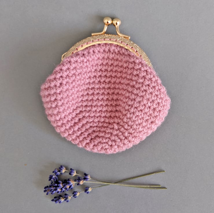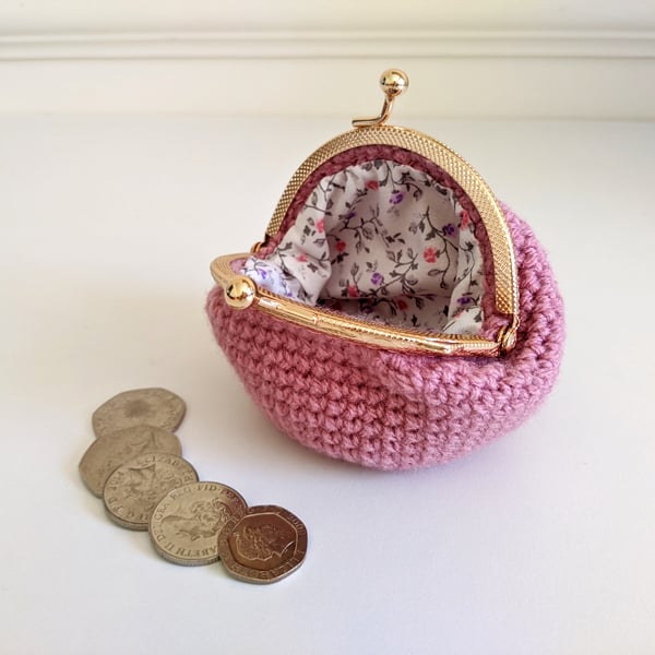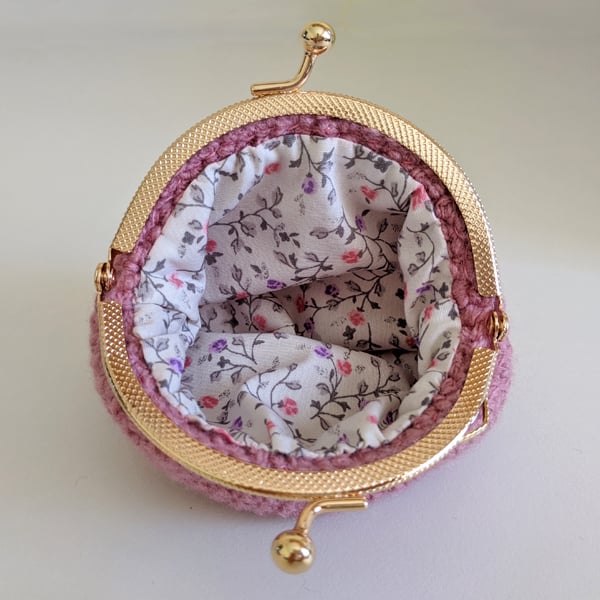 Crocheted from a rose pink yarn it features a bright gold-coloured embossed metal kiss clasp frame and a pretty floral print lining.