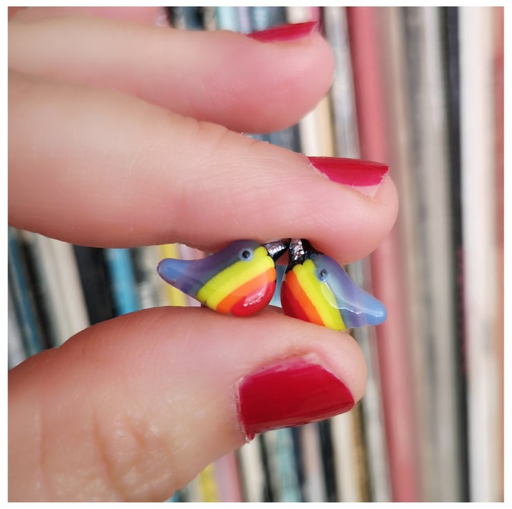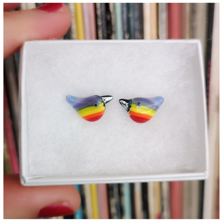 These little bird earrings are a labour of love as I make the rainbow glass and then grind each bird into shape by hand, using cold working tools and machinery, before a second and sometime third firing. I am mostly taking away glass to grind and carve into shape.
