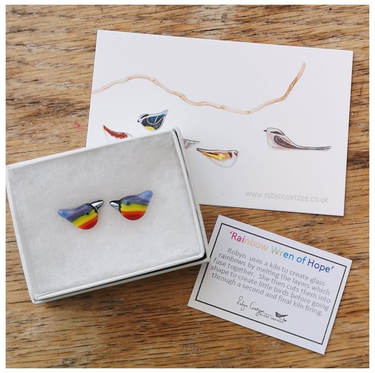 This listing is for a cute pair of wee 'Rainbow Wren of Hope' glass earrings on sterling silver ear posts.