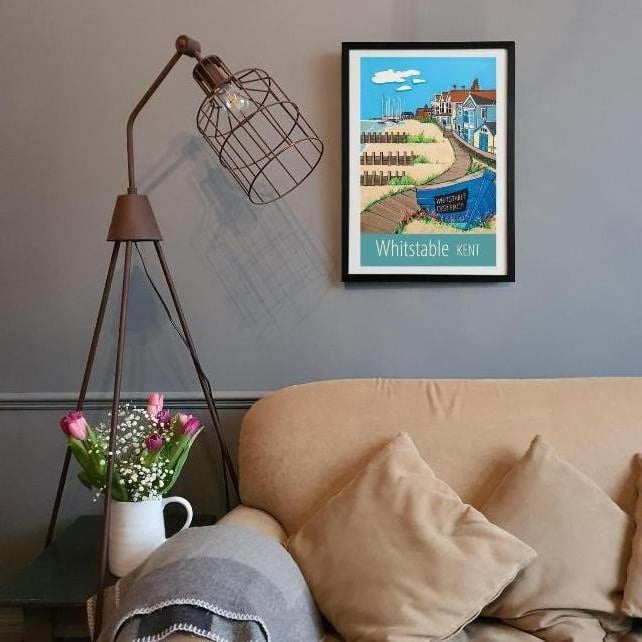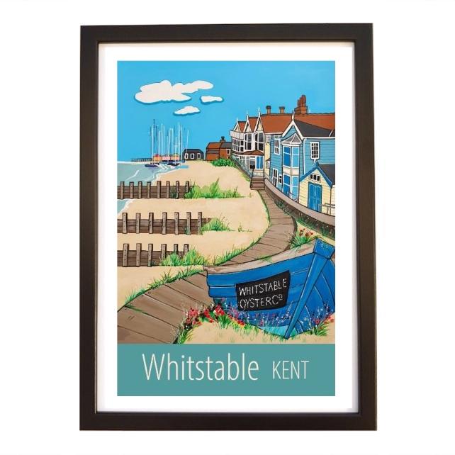 A contemporary travel poster style print of the lovely seafront and beach in Whitstable, Kent, from my own original acrylic painting.