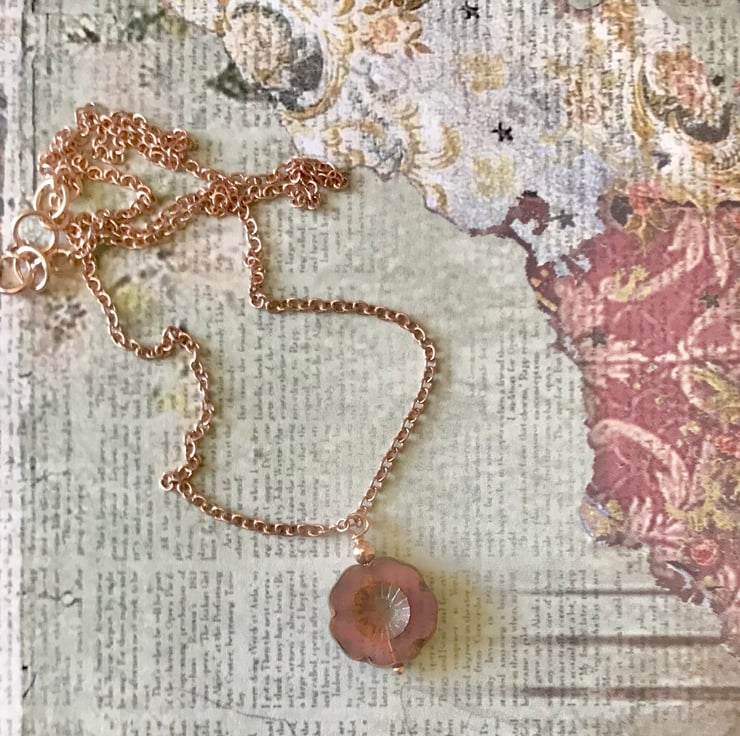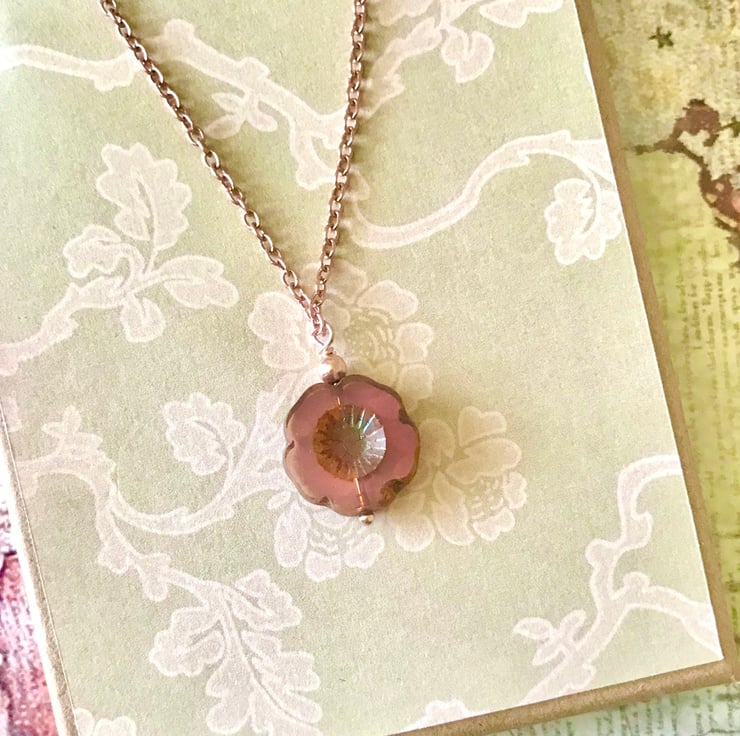 Pretty Czech glass flower bead with a stunning sterling silver, rose gold plated chain (17ins) & can be lengthened. The focal bead flower is a stunning smoky plum colour, which looks amazing with the rose gold vermeil chain