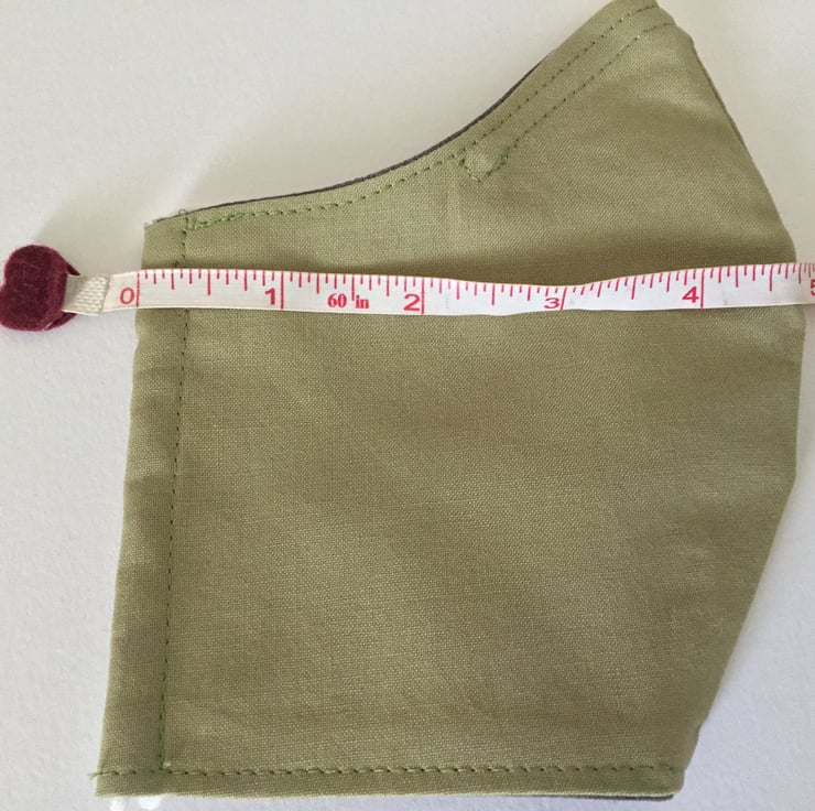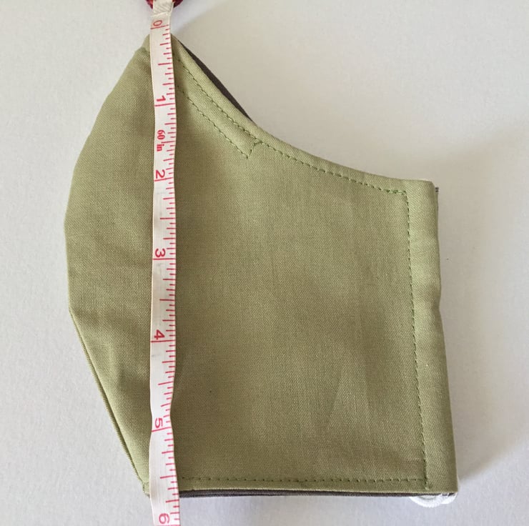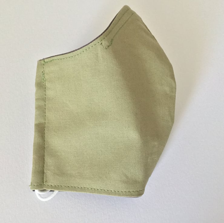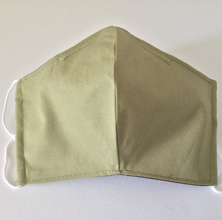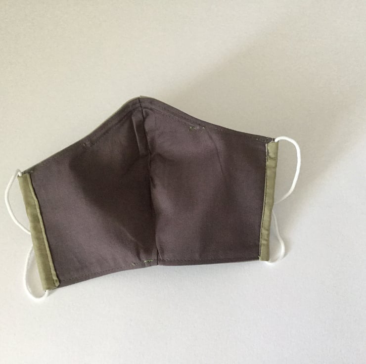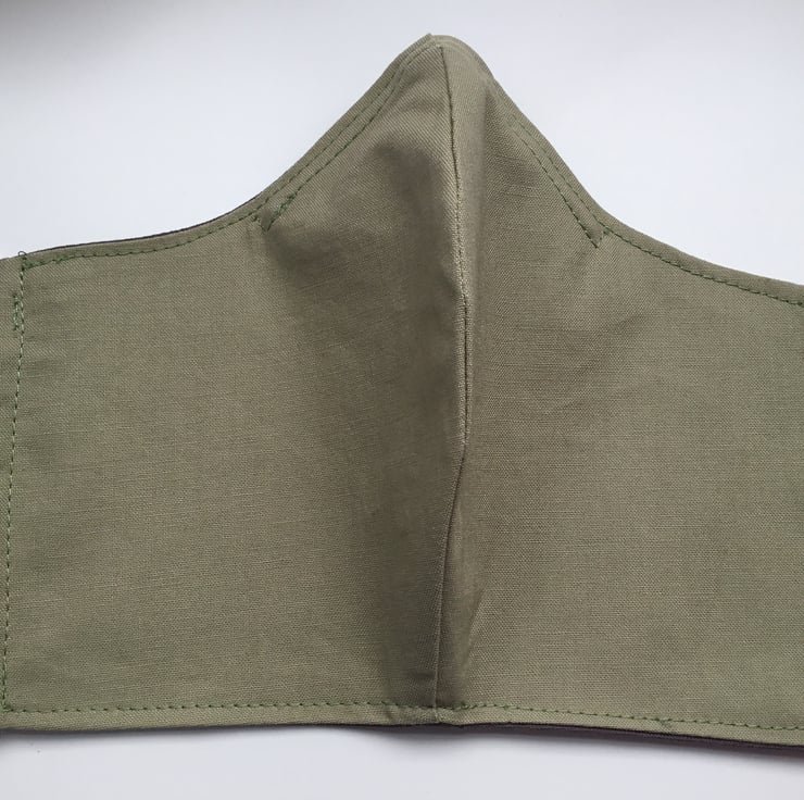 Larger size Khaki face covering with elastic ear loops and nose wire, the elastic is a generous length to fit different sizes. The fabrics are from Moda which are a good quality quilting cotton.