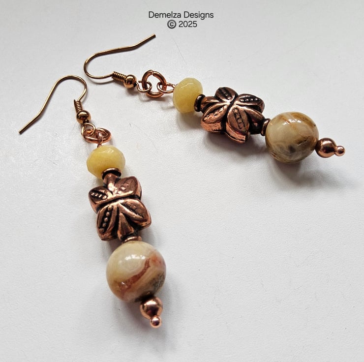 The earrings have a decorative copper centre bead with matching bracelet gemstones as described. The earrings wires are rose gold plated over copper and nickel free.