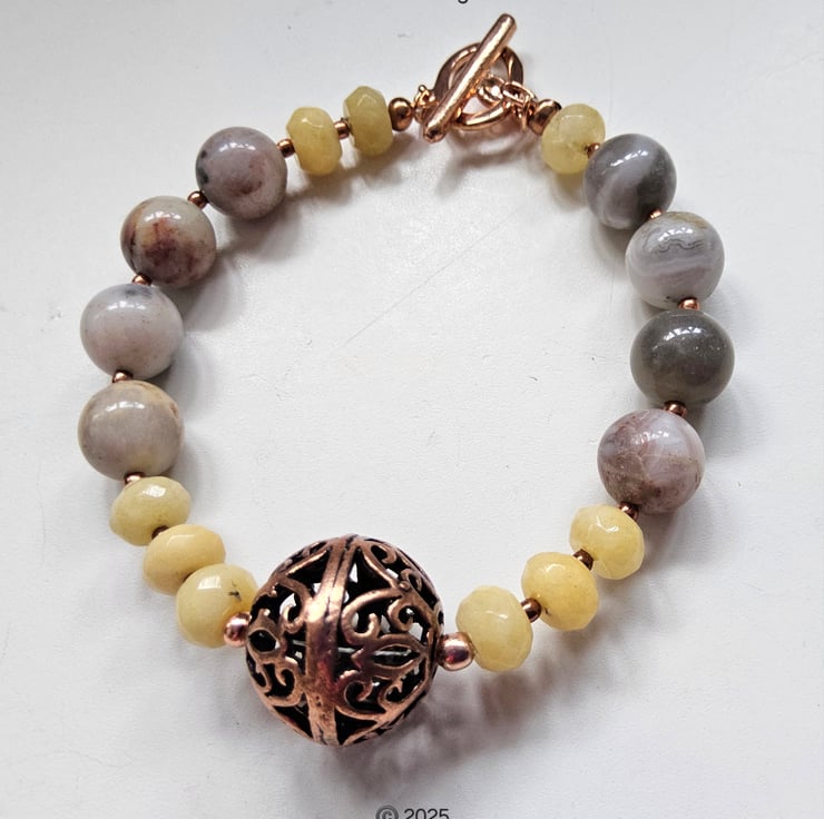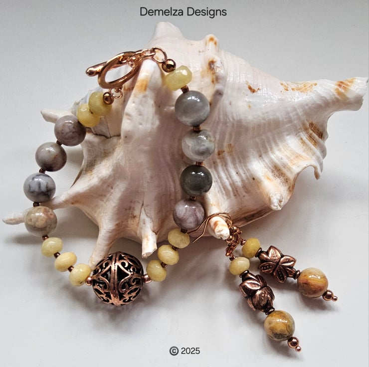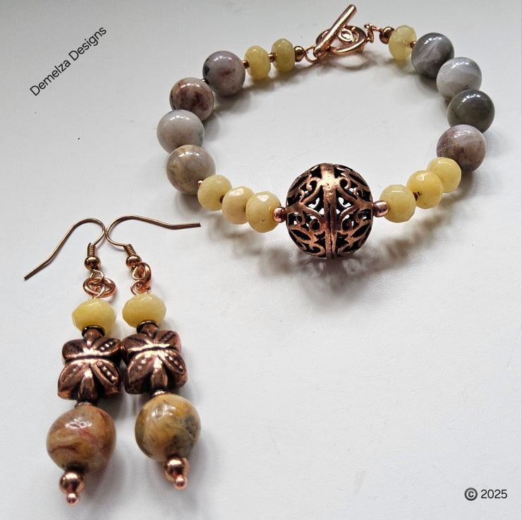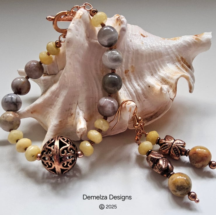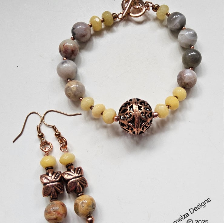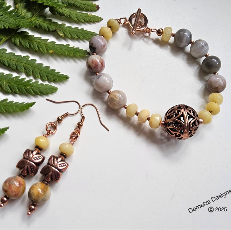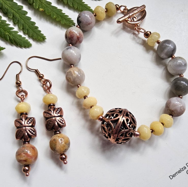 A stunning statement bracelet and earrings set designed and lovingly hand crafted in Cornwall using quality 10mm agate rounds with beautiful natural markings, complimented with faceted 8mm by 5mm jade rondelles. In the centre of the bracelet is a genuine large copper hand crafted bead. Between each gemstone are 2mm rose gold plated over copper spacer beads.