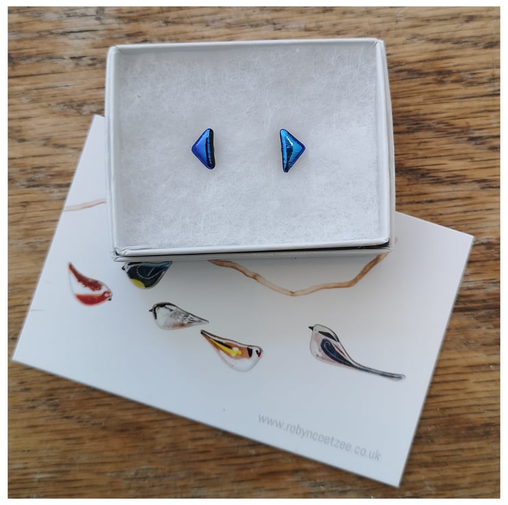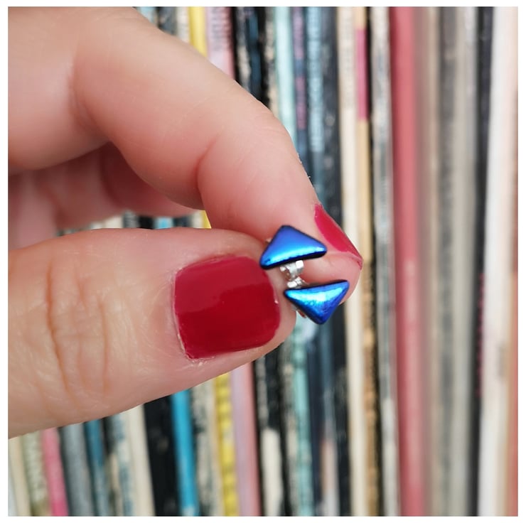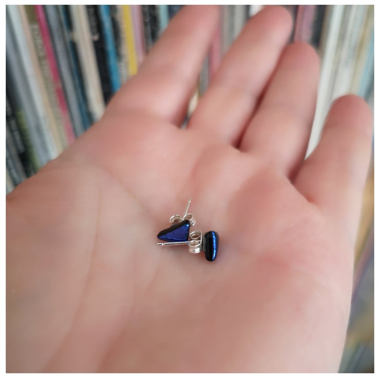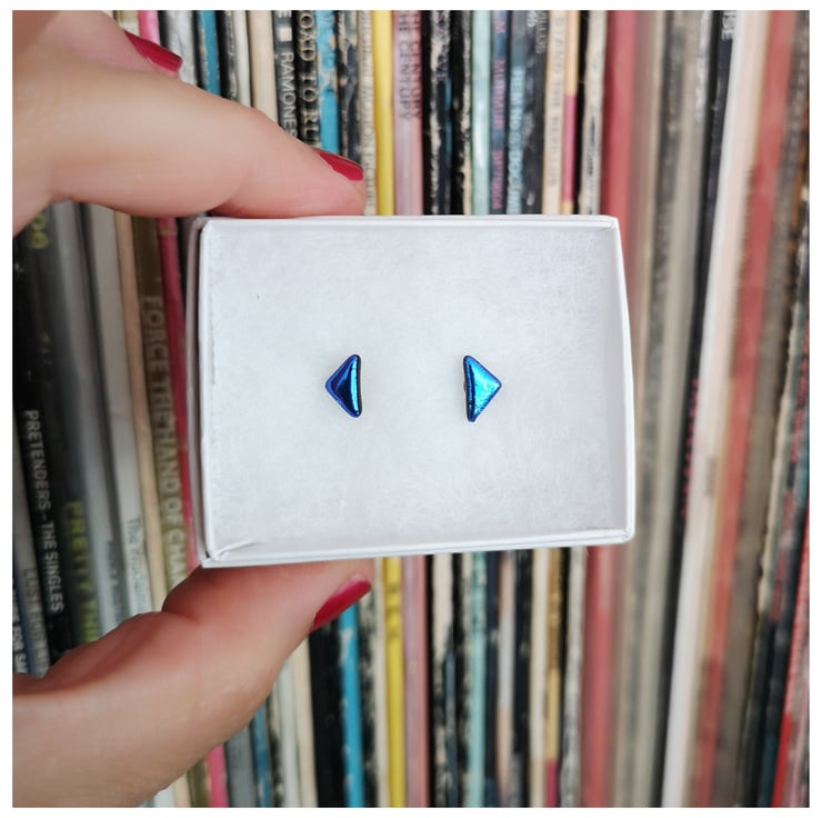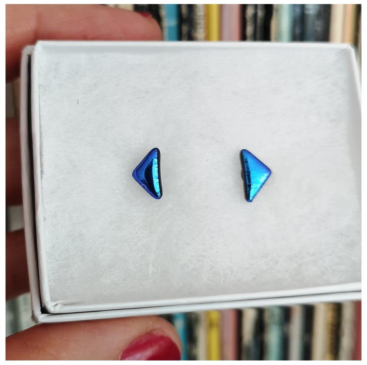 This listing is for one pair of Xtra small blue triangle dichroic glass stud earrings which shift between blue/purple and turquoise depending on your angle of view. They are on sterling silver posts. These are really cute and perfect for a bit of sparkle in your ear. They have a shiny texture.