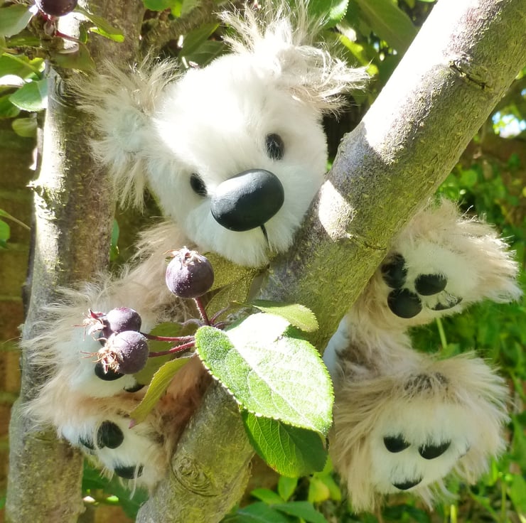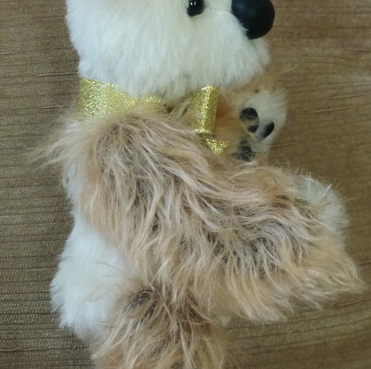 Hello, my name is sugar. I'm a very special bear hand sewn by Karen Blake using mohair fabric. I have a unique personality thanks to the glass eyes, hand crafted nose and paw pads, which have been lovingly attached as well as the hand embroidered mouth. Thanks to the cotter joints, I am able to come to life by moving my head, arms and legs and as with all Summertree bears I have a small heart pendant attached to my belly which reads 'Handmade with love'. When I am sitting down I am approximately 6 inches or 15cm high, so won't take up too much room. I certainly am one of a kind and will put a smile on your face.
