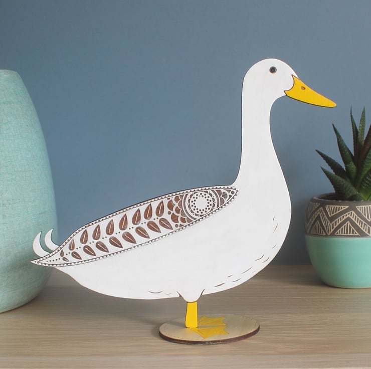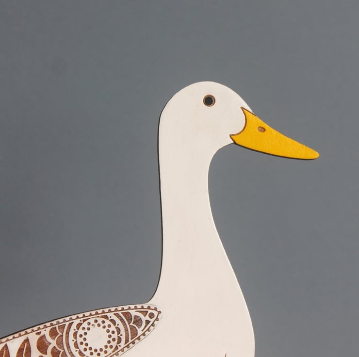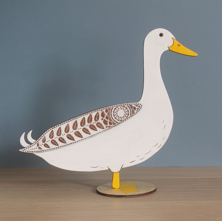 He has been cut from 3mm ply, and has been painted all white with etched feathery markings around his belly, and a gorgeous bright yellow bill and legs. He also features a etched wing with a pretty leafy, floral pattern. He’s finished with a gloss varnish to keep him looking lovely.