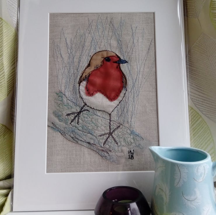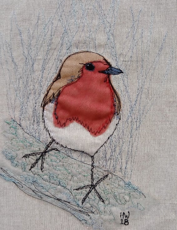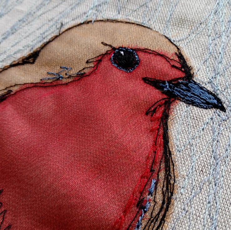 Who doesn't love a robin? With their chirpy song, inquisitive nature and gorgeous red breast it's no wonder they're one of our national favourites. I love to watch them in my garden, inspecting everything and ensuring standards are maintained. This Robin spotted me at a nearby nature reserve on a cold and grey day. I've added some sheer organza applique layers which add just a hint of sparkle if you look closely, just as all that moisture on a wet winter day sparkles. My Robin is worked on natural coloured linen with machine embroidery threads using my trusty old Bernina sewing machine as my drawing tool.