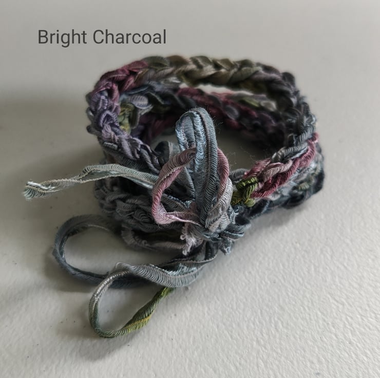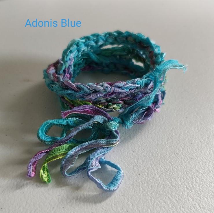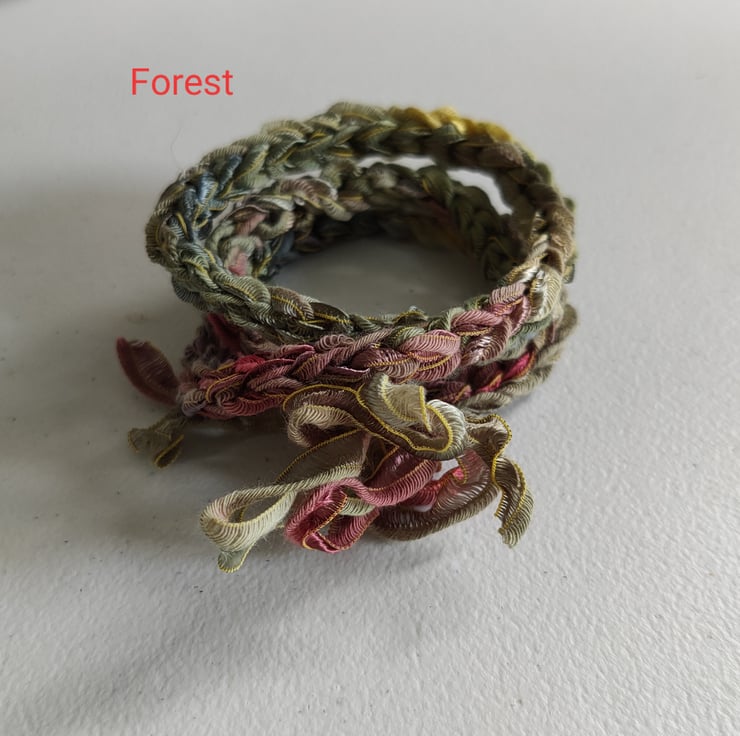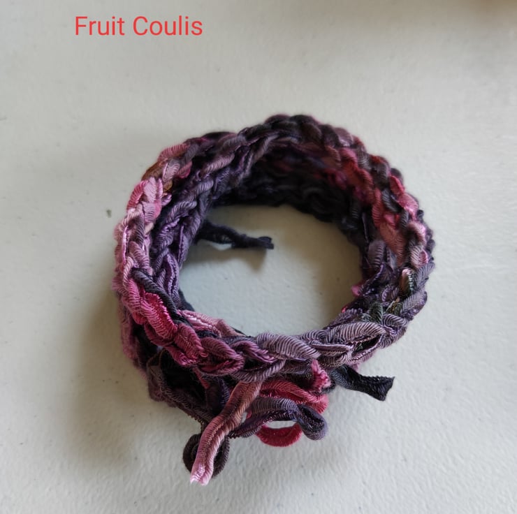 A bracelet that you wrap around your wrist 2-3 times. It's made in a ribbon yarn consisting of cotton, rayon and nylon with a tie fastening so you can adjust the length.