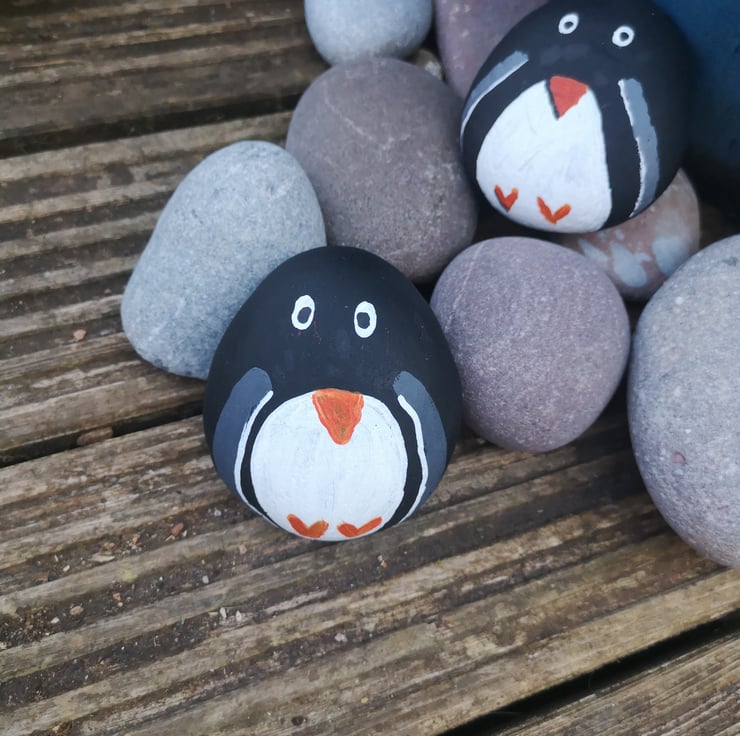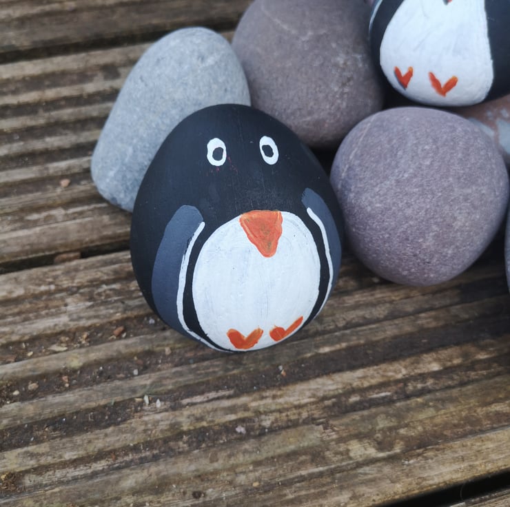 Cute penguin painted rock pebble. Painted with acrylics and sprayed with lacquer so can be left outside.