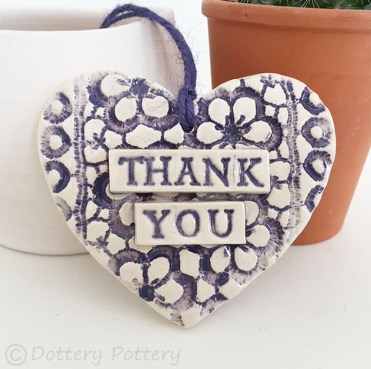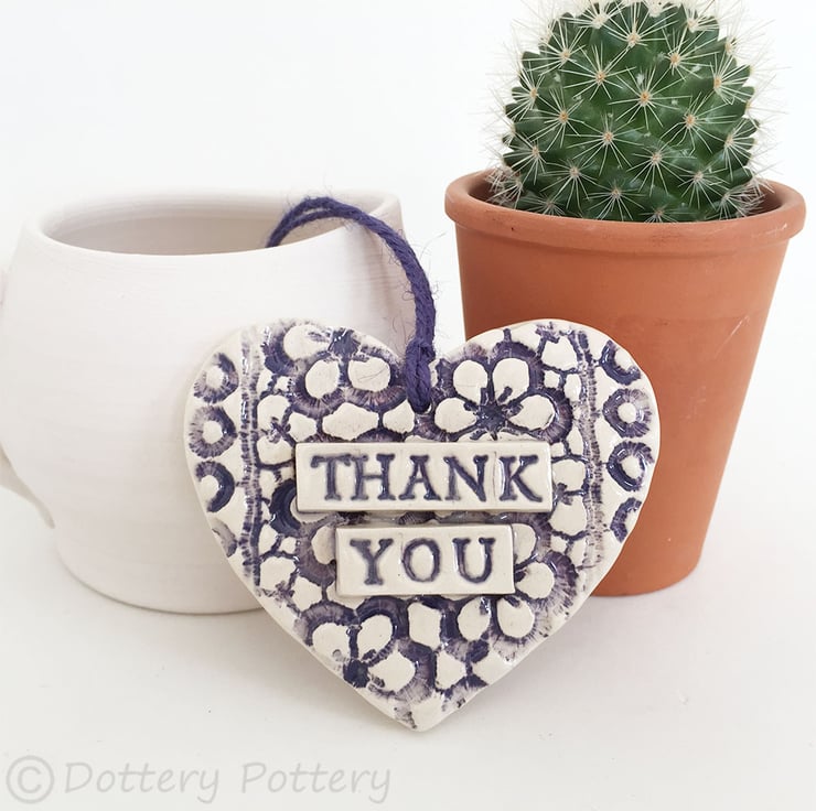 Pottery Thank You heart with flower design. This little heart is made from white earthenware clay and decorated with a bright floral design. It has then been fired once, glazed and fired again. It measures 8cm wide x 7 cm high and 1cm deep.