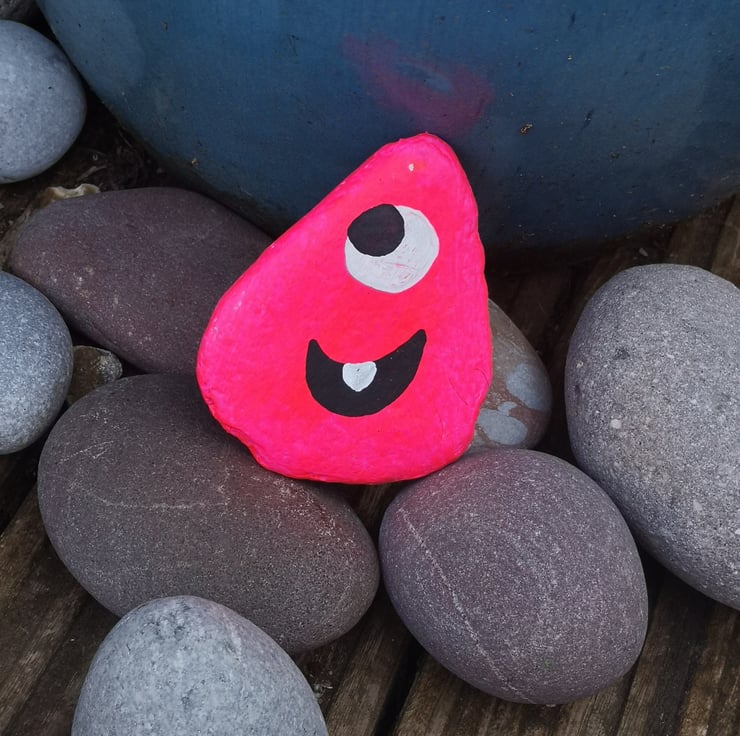 This is a flat pebble painted in bright fleuresent acrylic paint and sprayed with lacquer so can be left outside.