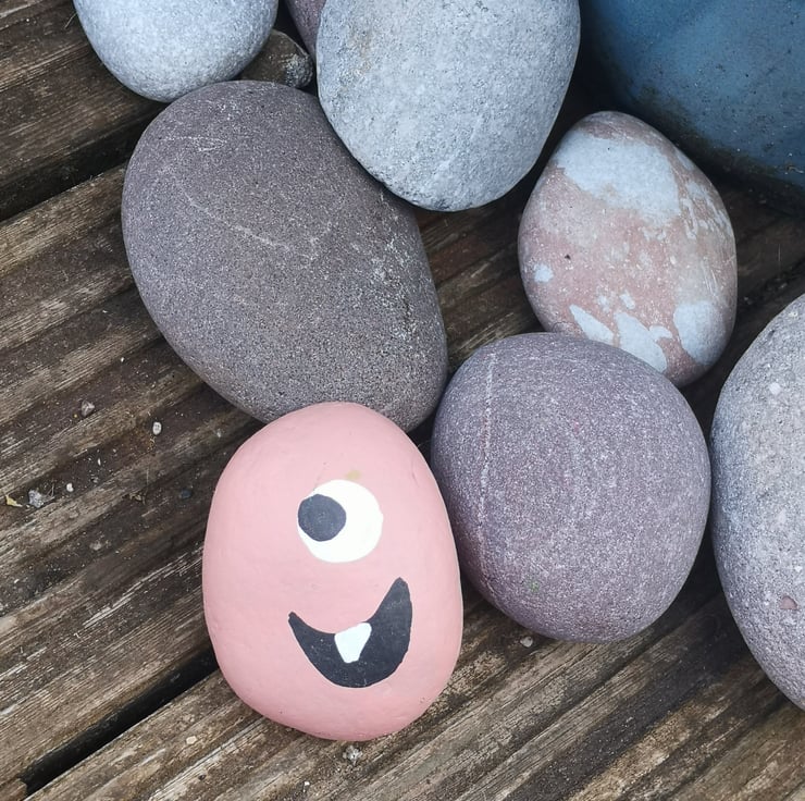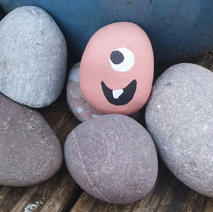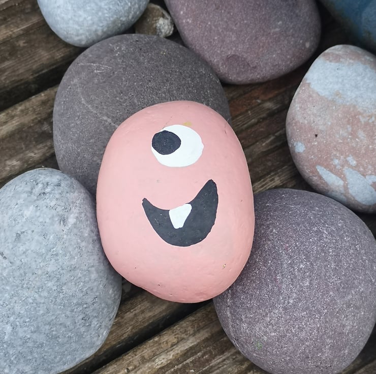 Pale pink pebble with funny face. Acrylic paint and sprayed with lacquer so can be left outside.