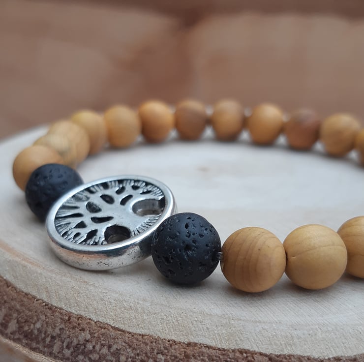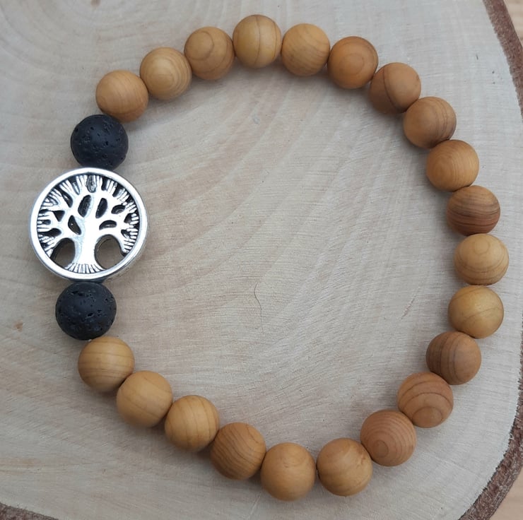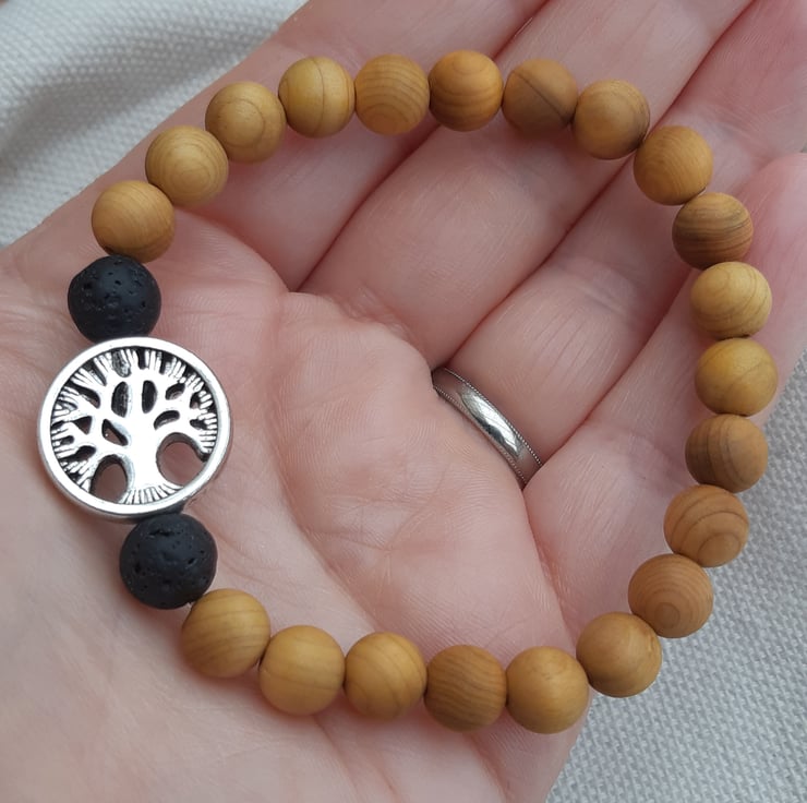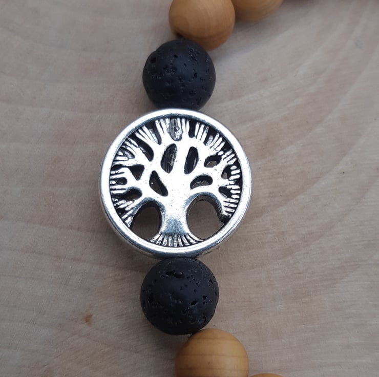 This diffuser bracelet is made from 8mm natural cedar wood beads combined with 8mm black lavastone beads and a silver toned 'tree of life' bead (approx. 17mm diameter, made from zinc metal alloy (lead, cadmium and nickel free)).