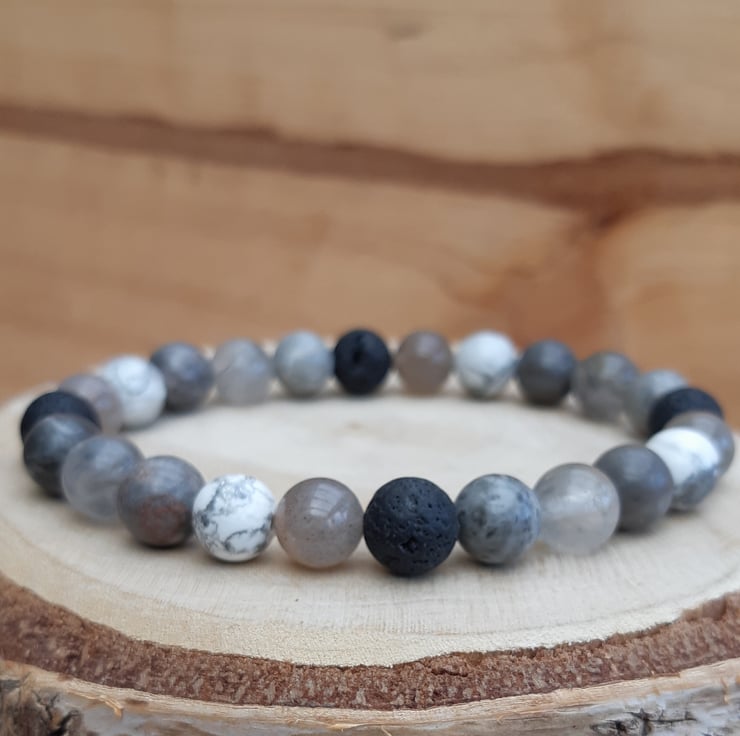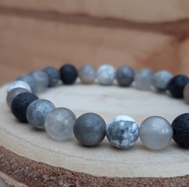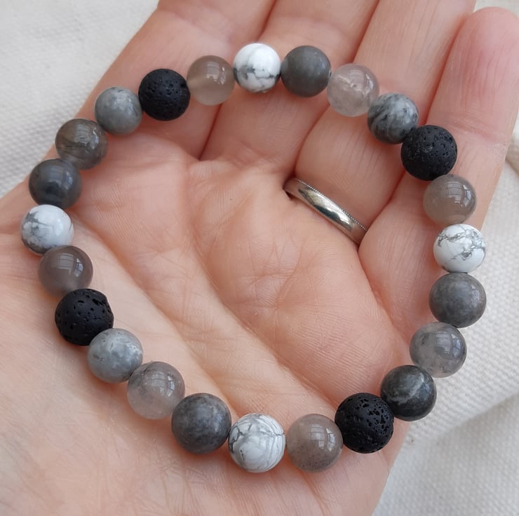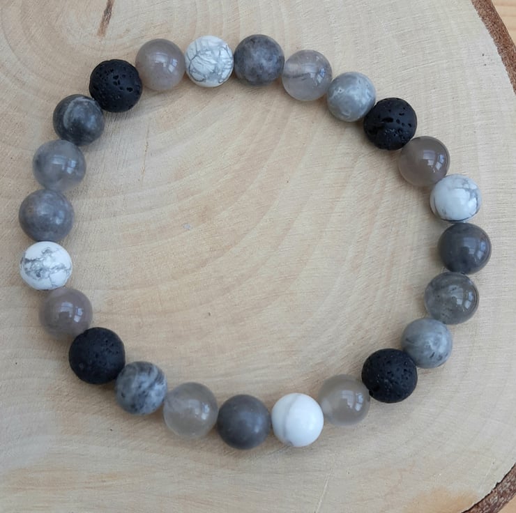 This bracelet is made with grey moonstone, howlite, zebra jasper, cloudy quartz and scenery jasper together with black lavastone beads (all are 8mm).