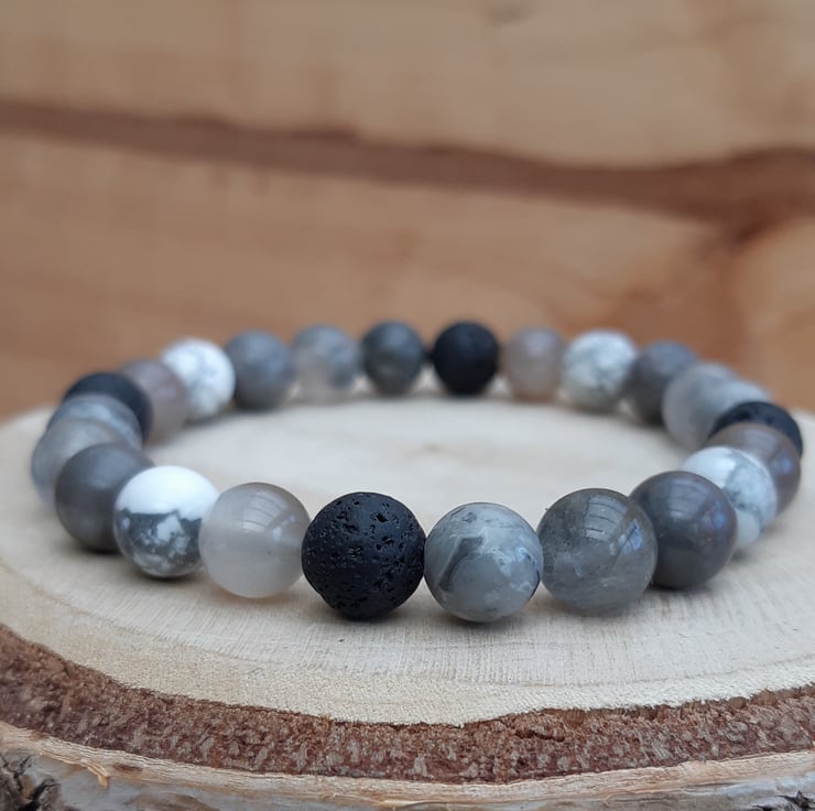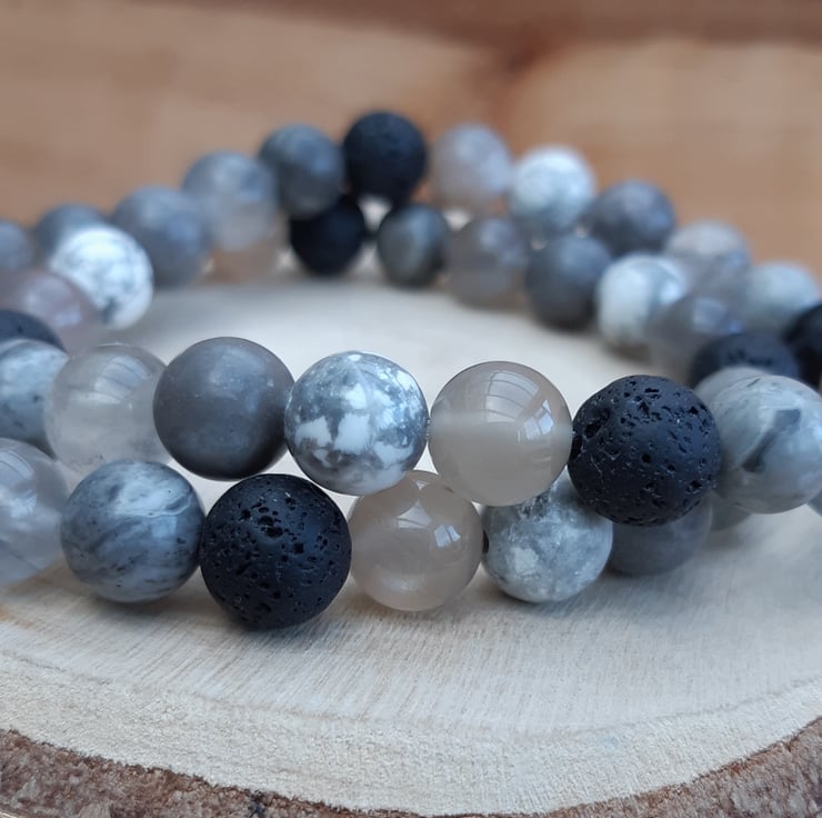 This bracelet is made with grey moonstone, howlite, zebra jasper, cloudy quartz and scenery jasper together with black lavastone beads (all are 8mm).