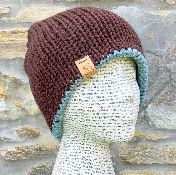 A very versatile hat that is cosy and warm. It has been knitted in a very soft chunky yarn, with shades of brown on one side (100 percent acrylic) and shades of blue to the other (77 percent Acrylic, 20 percent Alpaca, 3 percent Viscose).