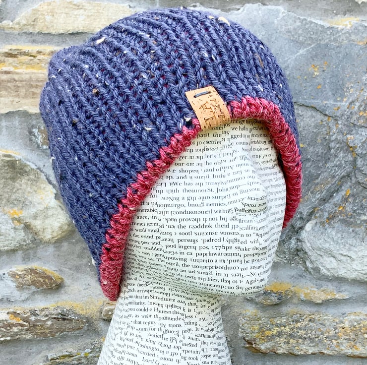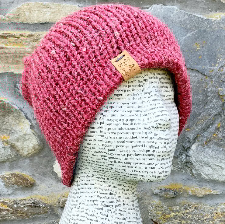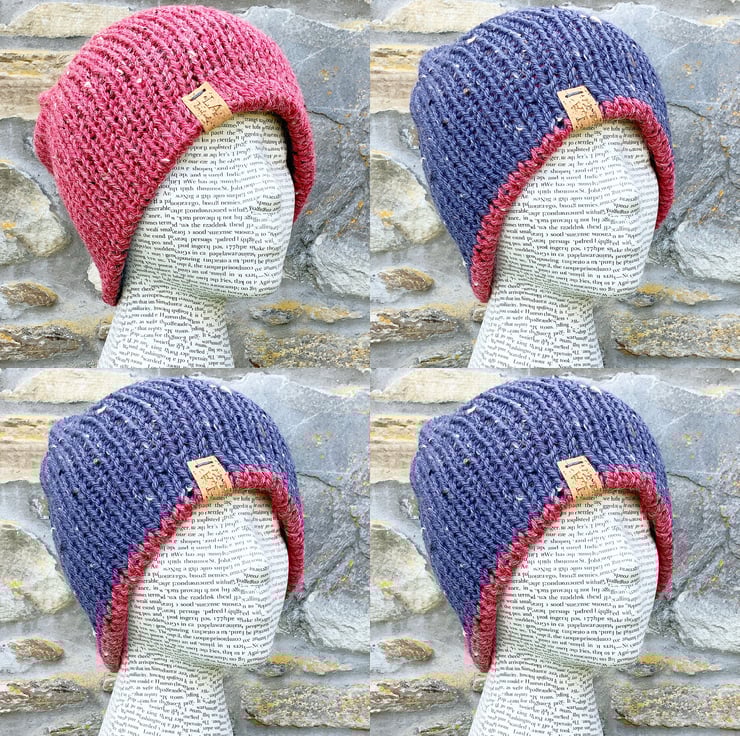 A very versatile hat that is cosy and warm. It has been knitted in a very soft chunky yarn, with shades of dark grey on one side and shades of dark pink to the other (77 percent Acrylic, 20 percent Alpaca, 3 percent Viscose).