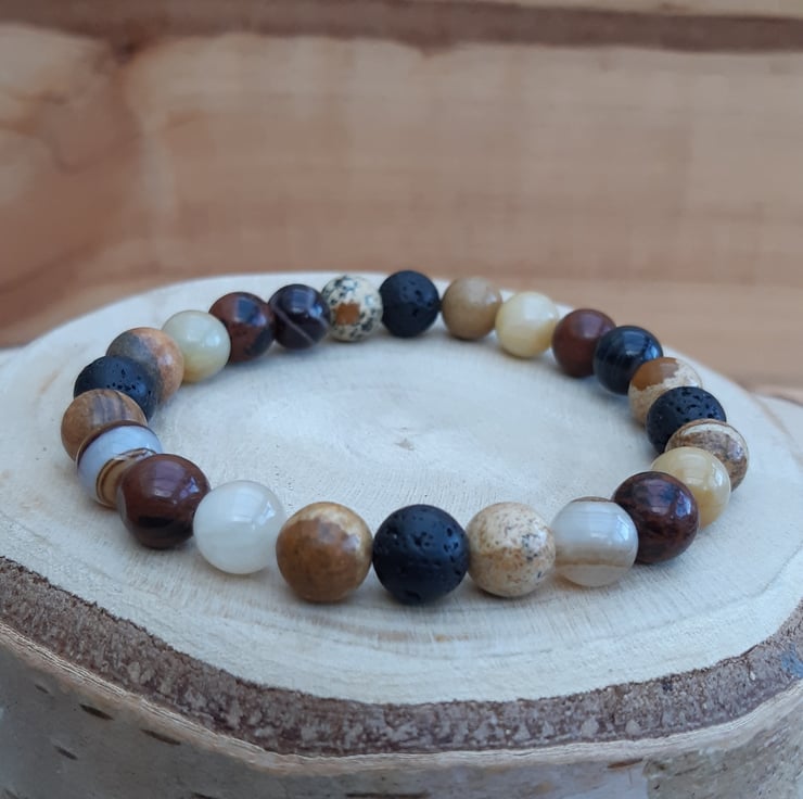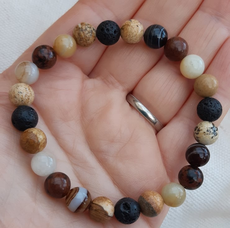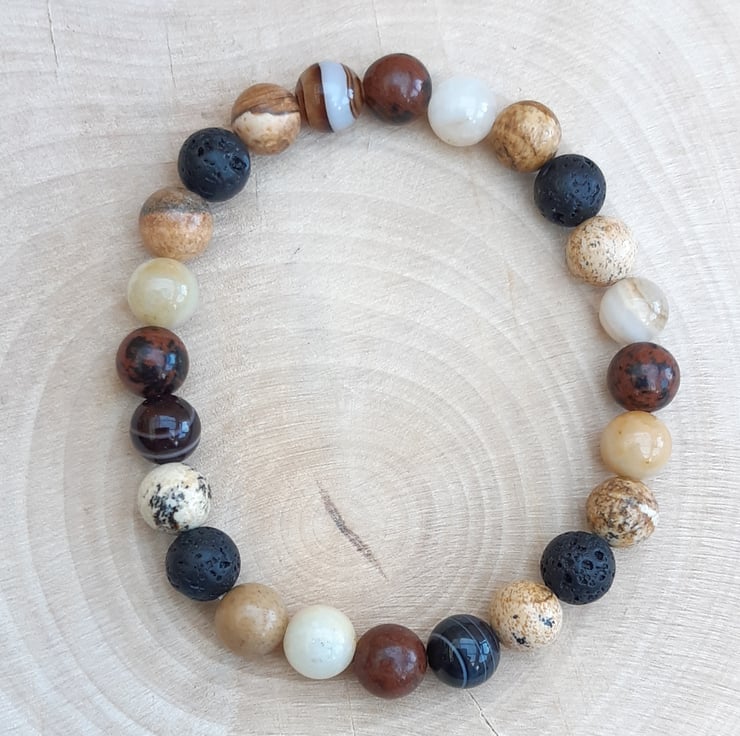 This natural diffuser bracelet is made with 8mm beads in lovely brown shades - picture jasper, brown striped agate, mahogany obsidian and Amazonite - combined with natural black lavastone beads.
