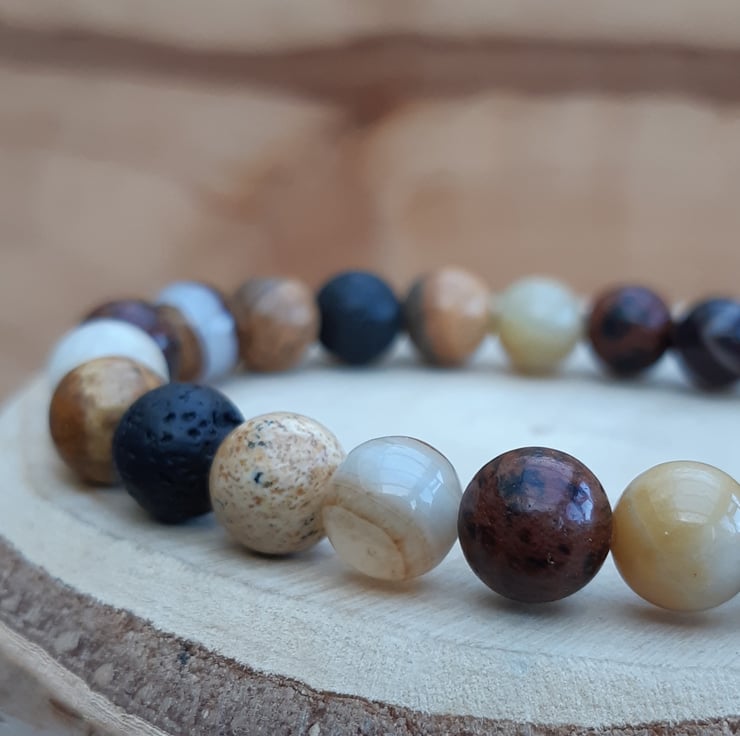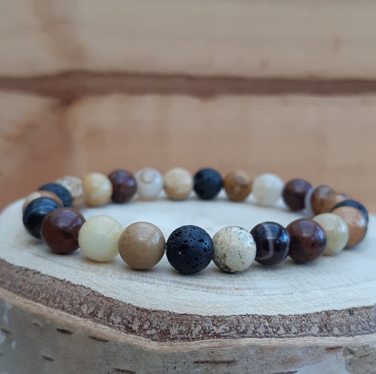 This natural diffuser bracelet is made with 8mm beads in lovely brown shades - picture jasper, brown striped agate, mahogany obsidian and Amazonite - combined with natural black lavastone beads.