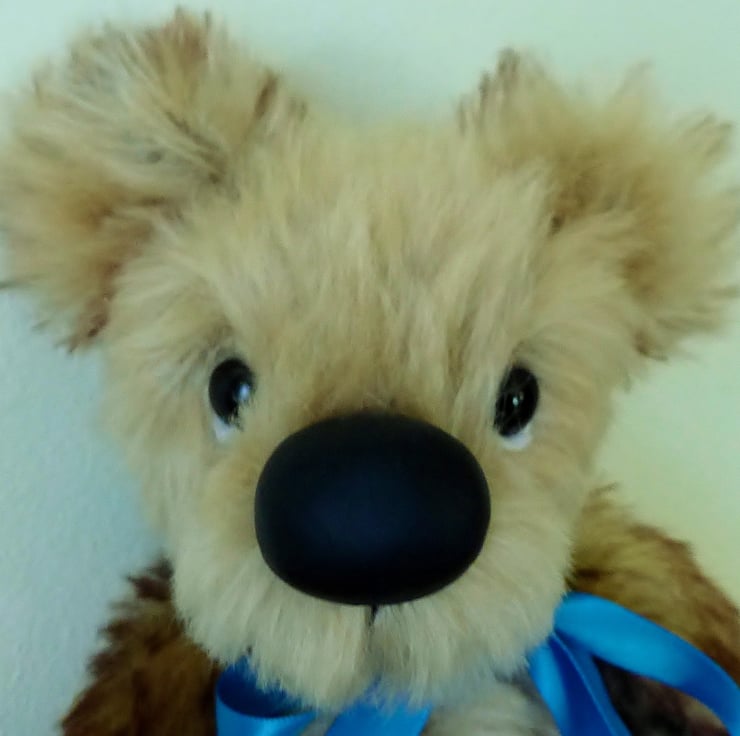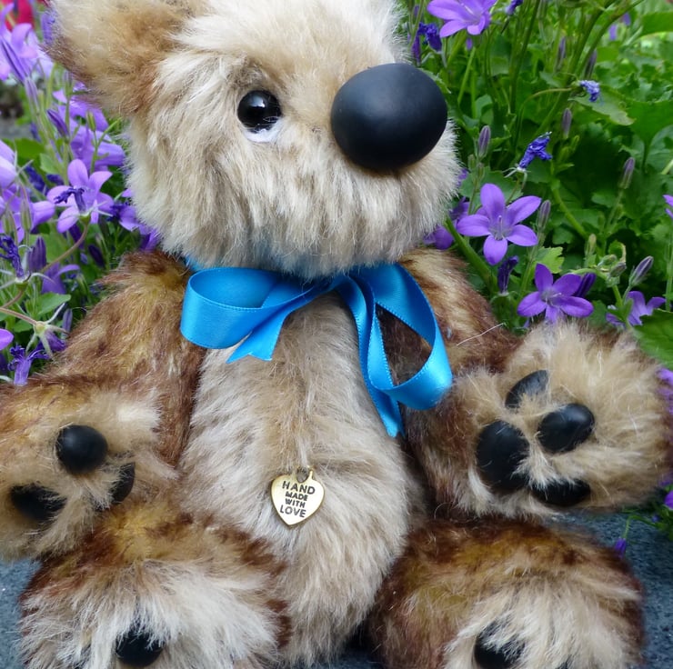 My name is Toffee and I am a one of a kind bear hand sewn by Karen Blake using quality mohair fabric. Glass eyes, a hand crafted nose and paw pads as well as a hand sewn mouth are all positioned to give me a unique personality. I am able to move my head, arms and legs thanks to the cotter joints which help bring me to life, and as with all Summertree bears I have a heart shaped pendant attached to my belly which reads 'hand made with love'. When I am sitting down I am approximately 6 inches or 15cm high, so won't take up too much room. I certainly am one of a kind and will put a smile on your face.