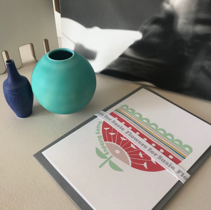 Inspired by Scandinavian patterns bright and fresh flower card is perfect for any birthday. The strong silhouette and simple soft graphic patterns with pops of colour really lift the flower off the page. The subtle wording on the underside of the flower head adds the unique aesthetic of this design.