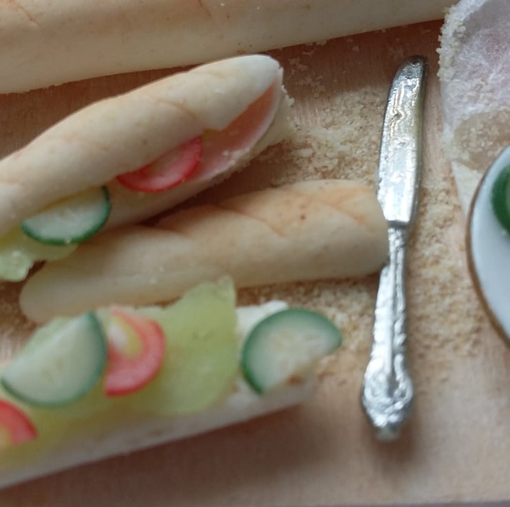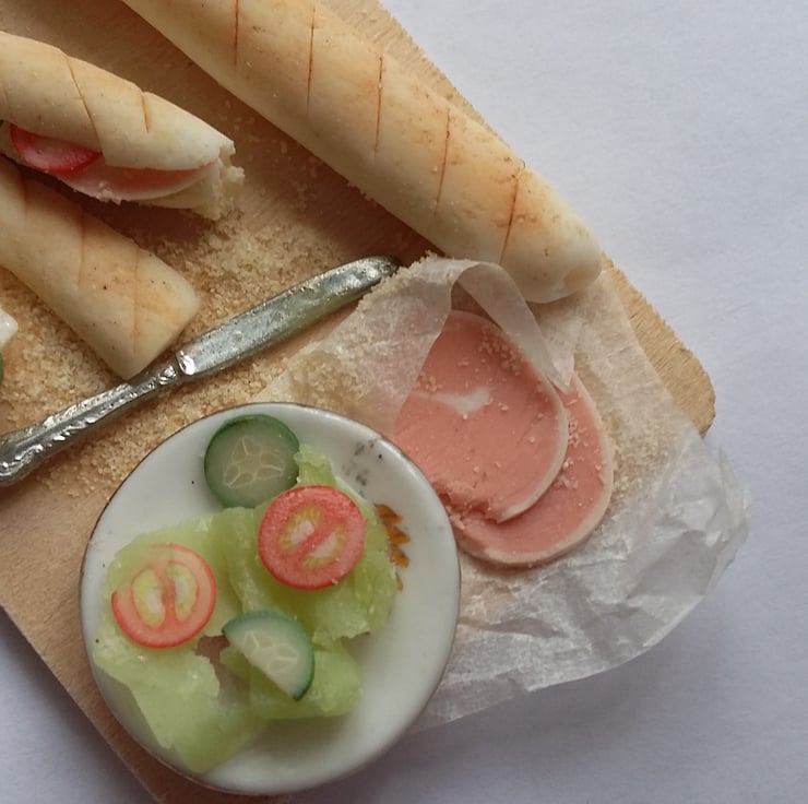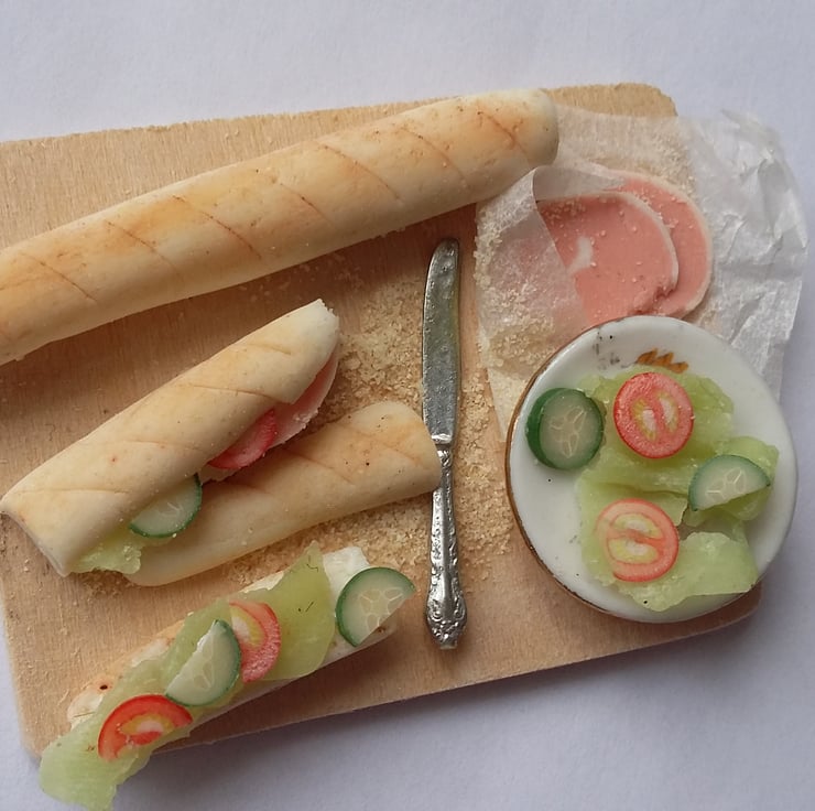 this is a handmade 12th scale wooden board with everything to make ham and salad sandwiches