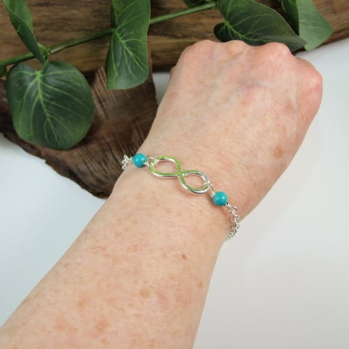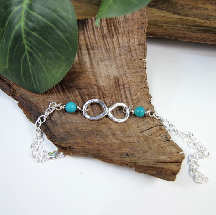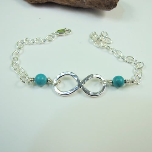 The infinity knot has been handcrafted from 2mm Sterling Silver wire, that I have cut, hand shaped, soldered and hammered for texture. Either side of the infiity knot are turquoise gemstone beads and sterling silver chain.