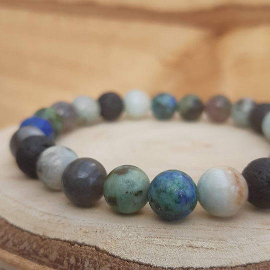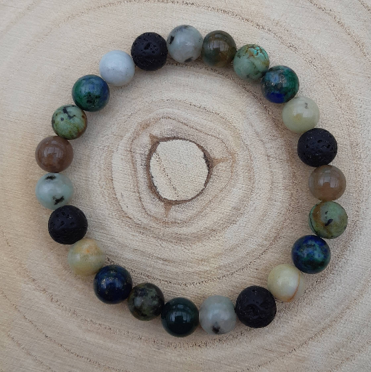 This natural diffuser bracelet is made with 8mm beads - Amazonite, chrysocolla, fancy jasper, African turquoise and sesame jasper - combined with black lavastone beads.