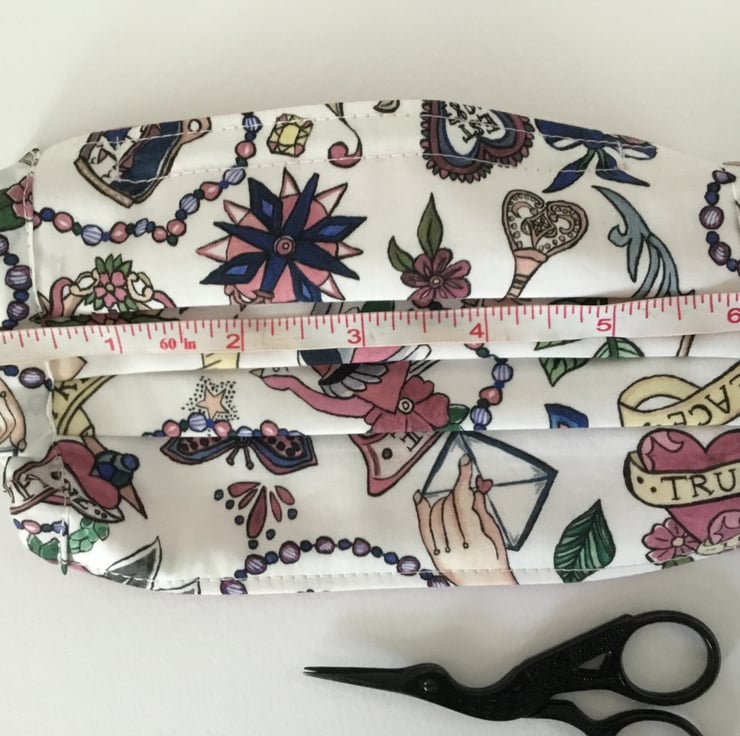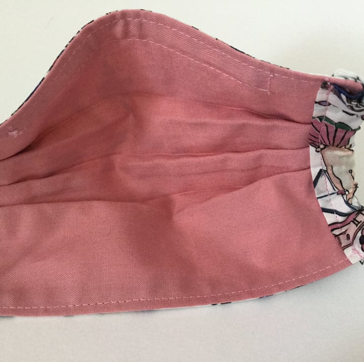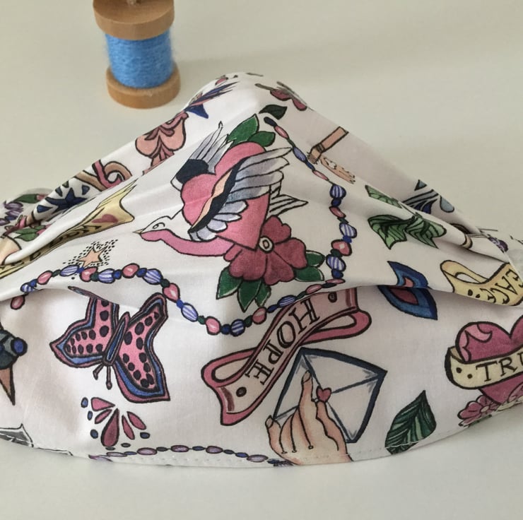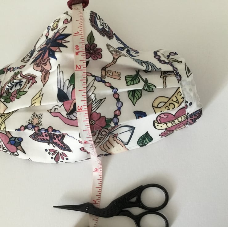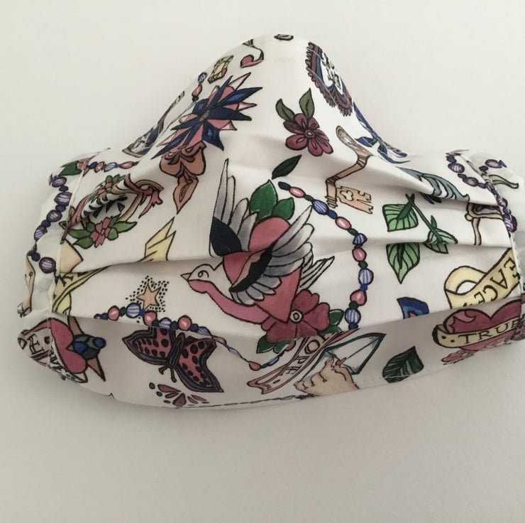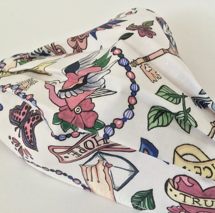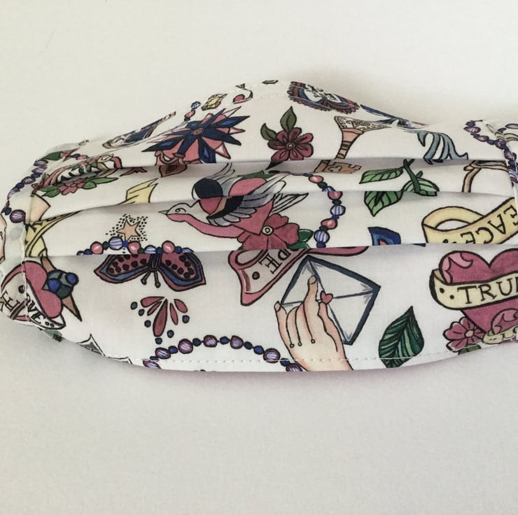 Face covering made from Liberty’s beautiful Love Letters Cotton Tana Lawn fabric, featuring a Dove in the centre of the mask. I have made this in triple fabric, and it comes with nose wire and elastic ear loops, with 30cm each side for you to adjust to size