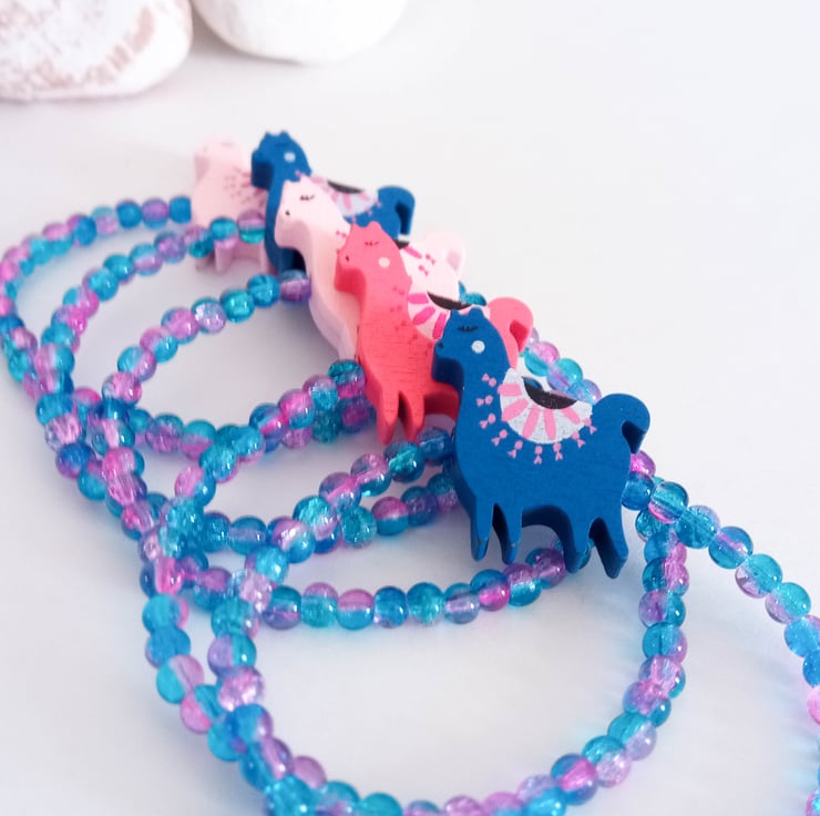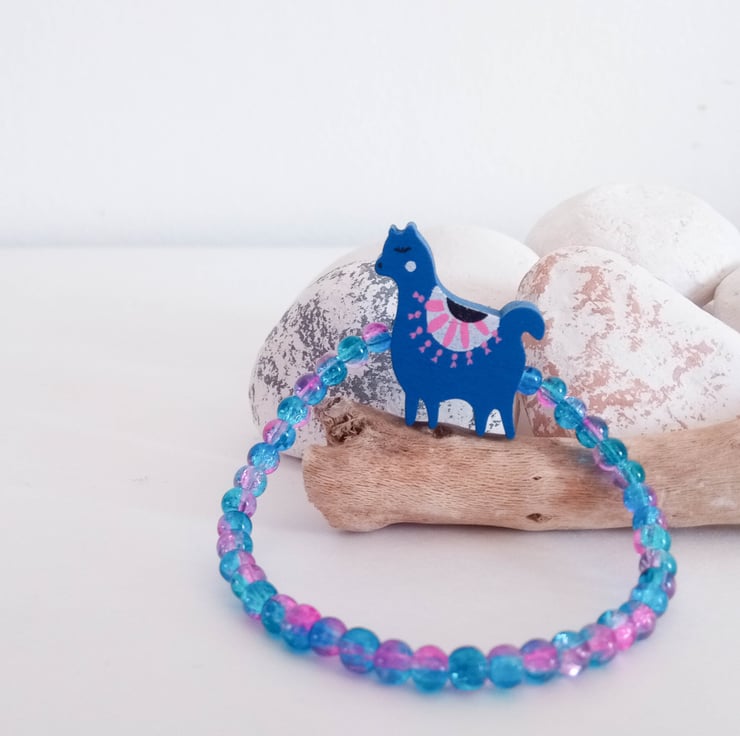 How cue is this blue alpaca/llama bracelet! The elastic bracelet features an alpaca/llama wooden charm together with turquoise and pink 4mm crackle beads