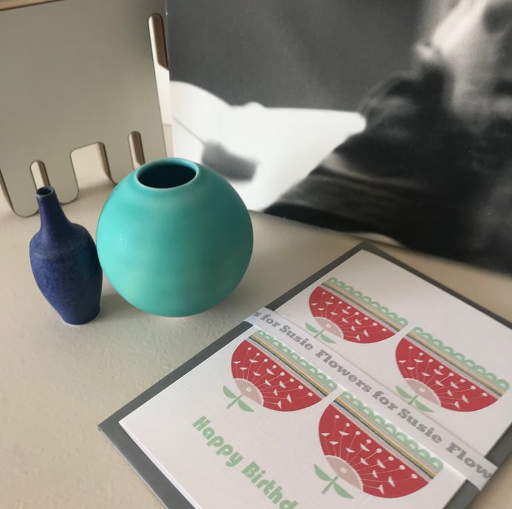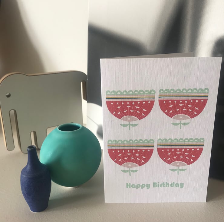 nspired by Scandinavian patterns bright and fresh flower card is perfect for any birthday. The strong silhouette and simple soft graphic patterns with pops of colour really lift the flower off the page. The subtle wording on the underside of the flower head adds the unique aesthetic of this design.