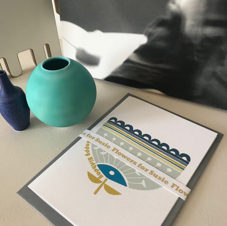 Inspired by Scandinavian patterns bright and fresh flower card is perfect for any birthday. The strong silhouette and simple soft graphic patterns with pops of colour really lift the flowers off the page. The subtle wording on the underside of the flower head adds the unique aesthetic of this design.