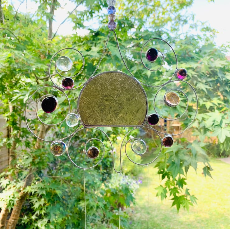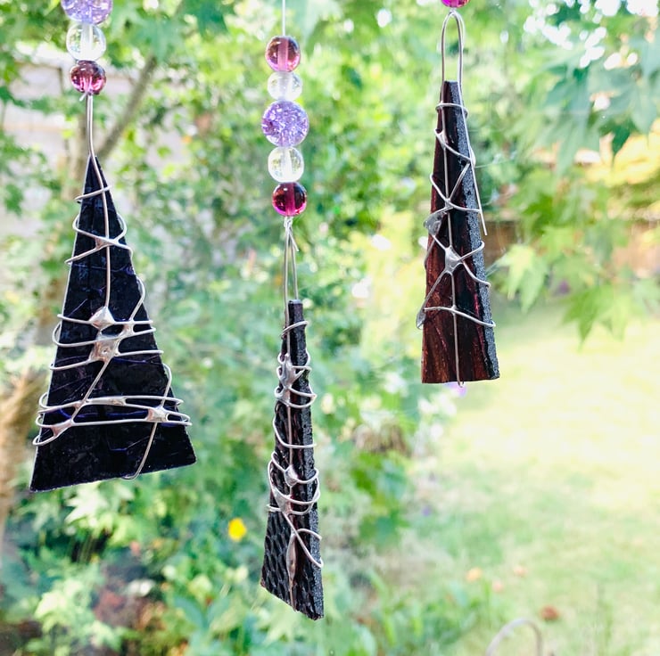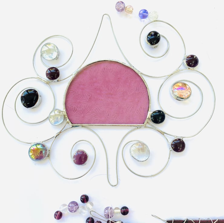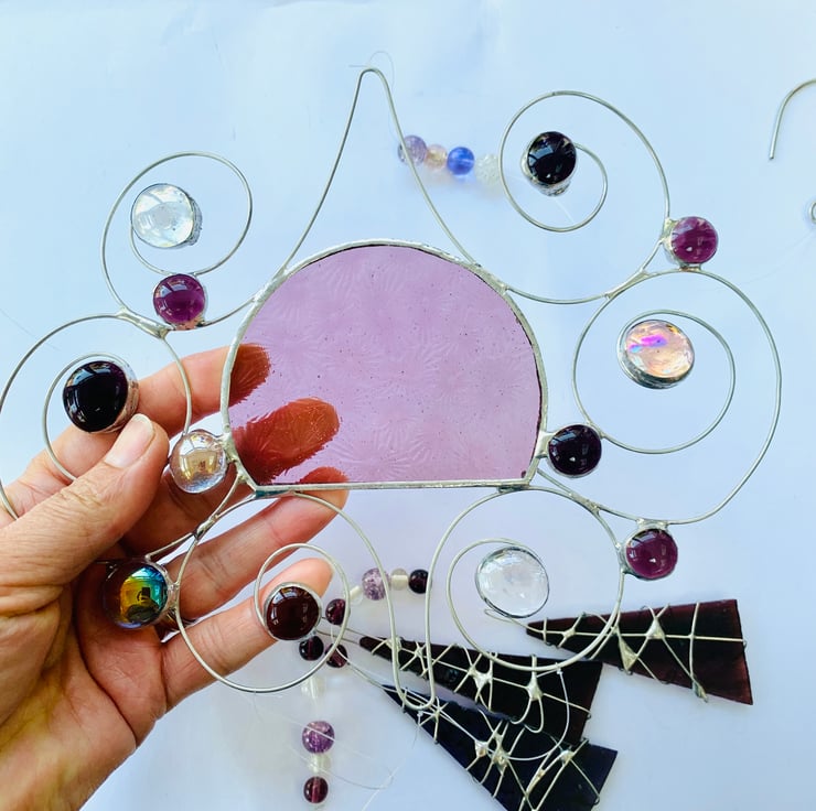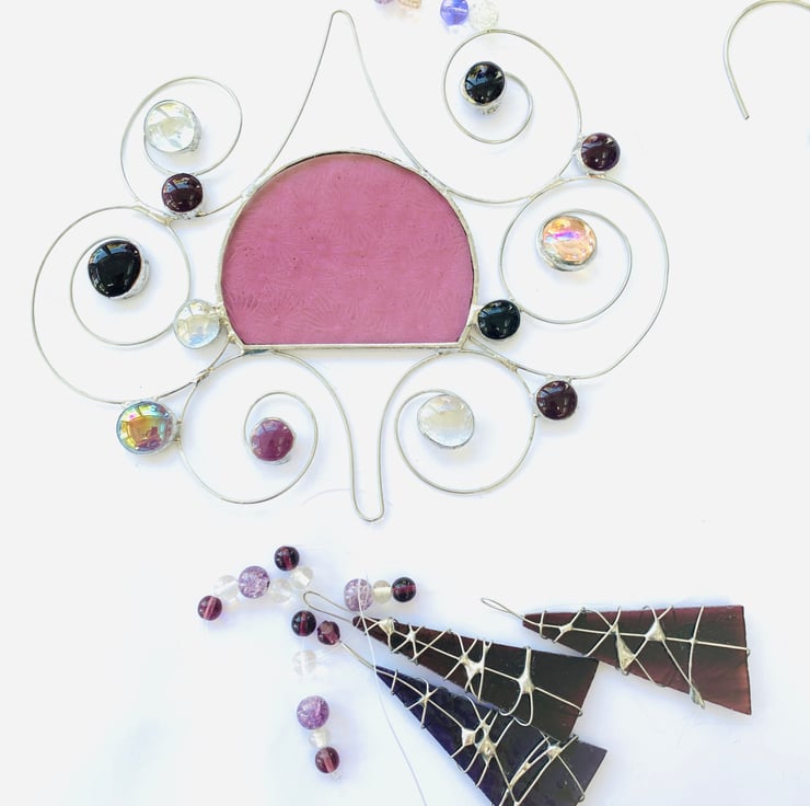 This has been made using a part circle of pink florentine glass, pink and mauve glass nuggets with curled tinned wire. The hanging parts are triangles of glass wrapped with thin wire and hung in beaded fishing line.
