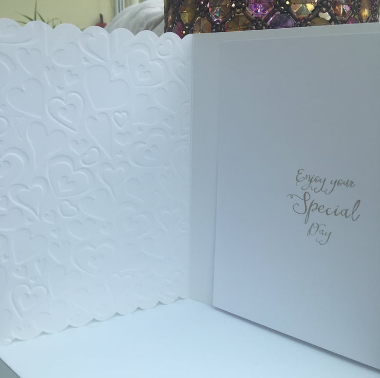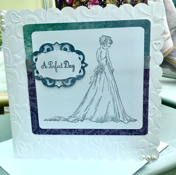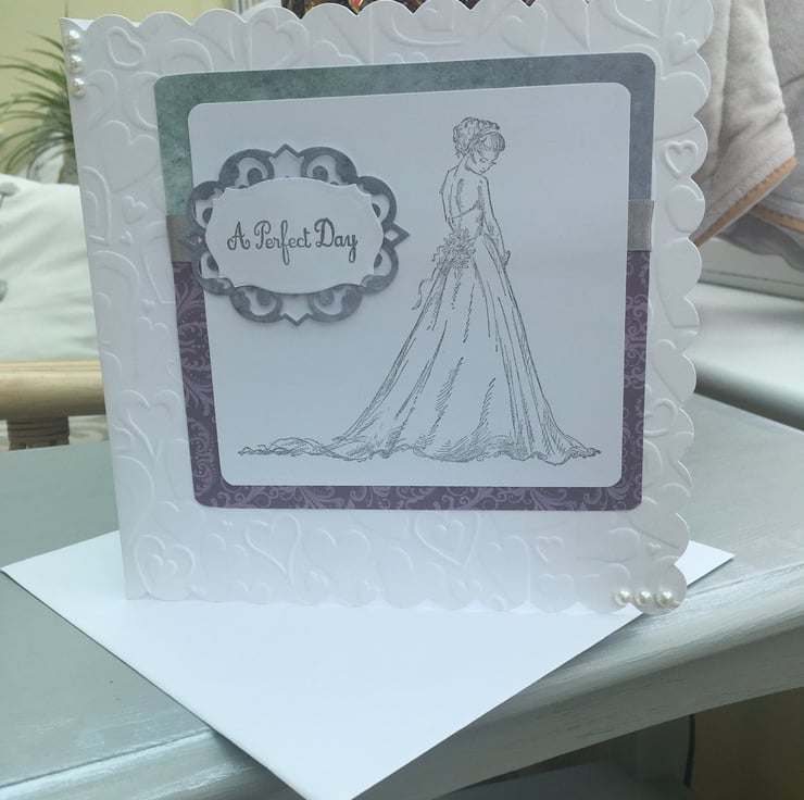 An 8x8in scalloped edge heart embossed card for a wedding. This card features a stamped image of a bride by LaBlanche. This is stamped onto white supersmooth card and is not coloured in. This is mounted onto decorative blue/grey paper with a decorative plaque with the words A Perfect Day stamed onto it. Grey satin ribbon is added for a small decoative feature. Inside the card has an insert with enjoy your special day in silver on it. White faux pearls finish the design.