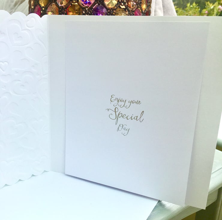 A day to remember is what every bride hopes for. This elegant card shows the bride contemplating the beautiful day to come. It would make a lovely wedding card or a card to the bride from someone special, Mum perhaps, to wish her all the love in the world for her special day.