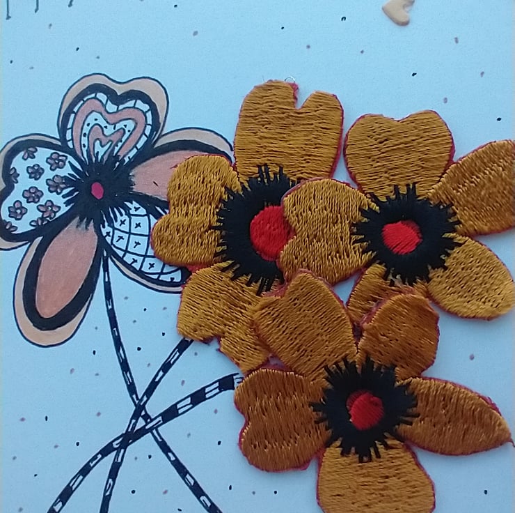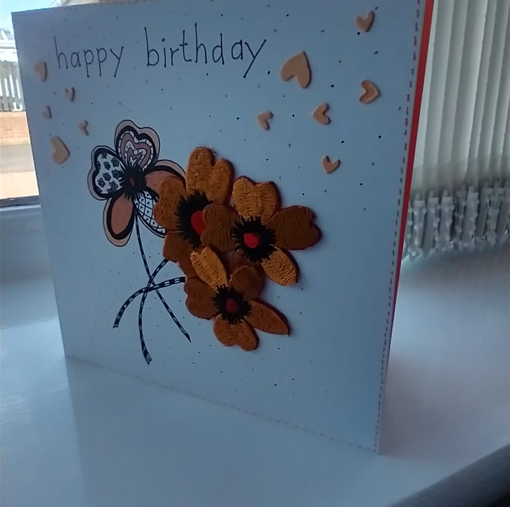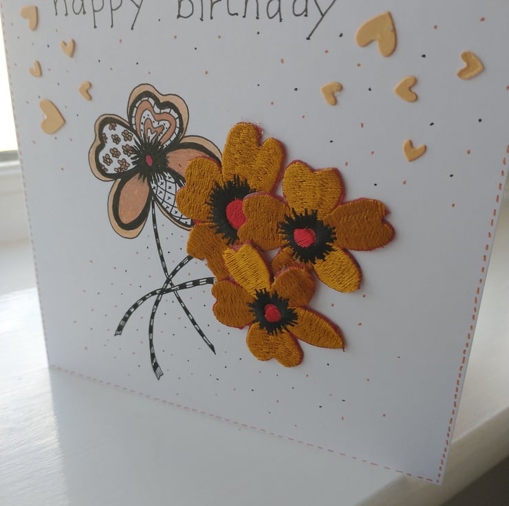 A completely handmade and uniquely designed card. Consisting of three embroidered daisies and one hand drawn and coloured on pristine white quality card. Happy birthday hand written in black ink. Finished off with gold hearts