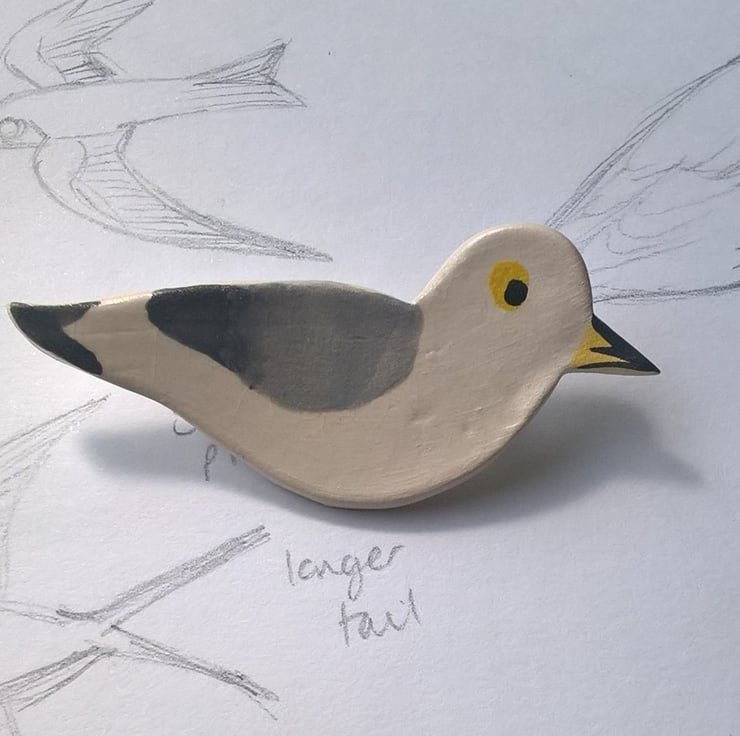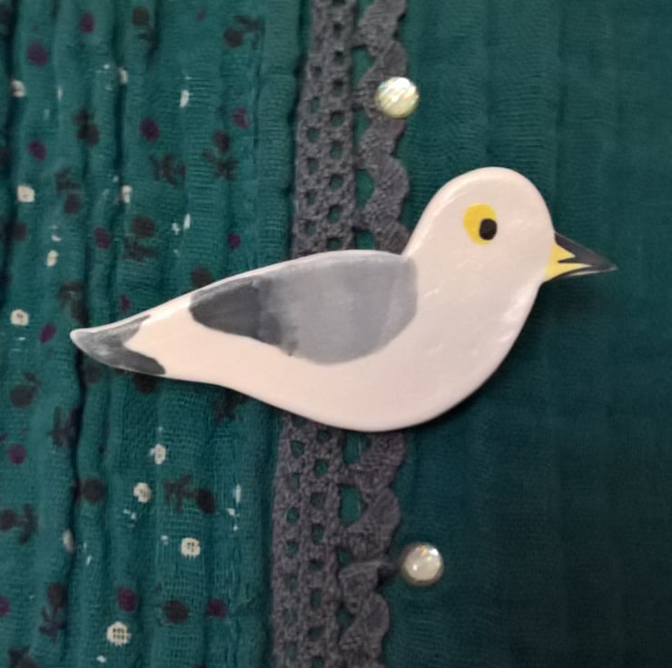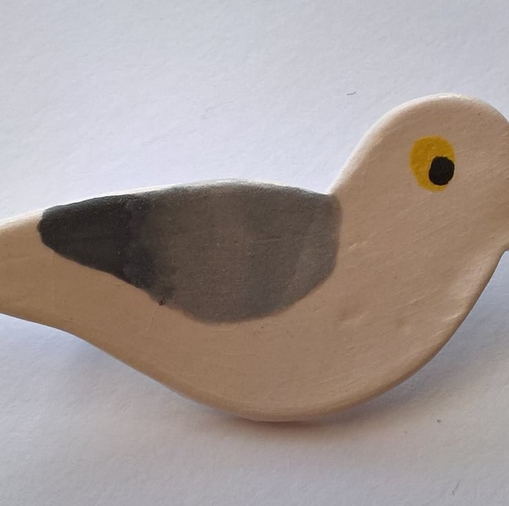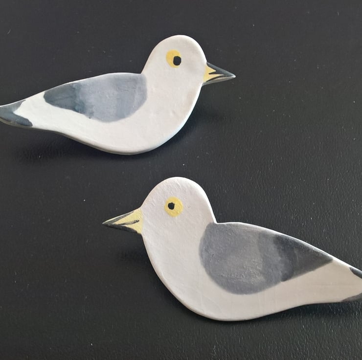A lovely ceramic seagull brooch, inspired by living at Brighton. I make a variety of animal brooches but this is the most popular. The process includes two kiln firings, I've hand painted the brooch with an underglaze paint and then dipped into a transparent shiny glaze, to give it, it's final finish.