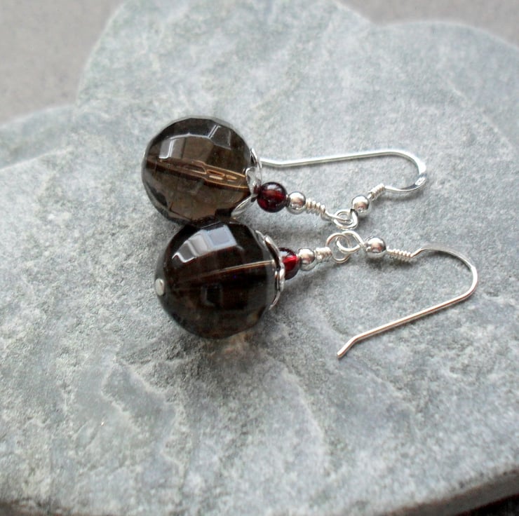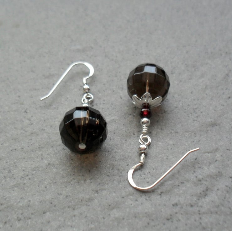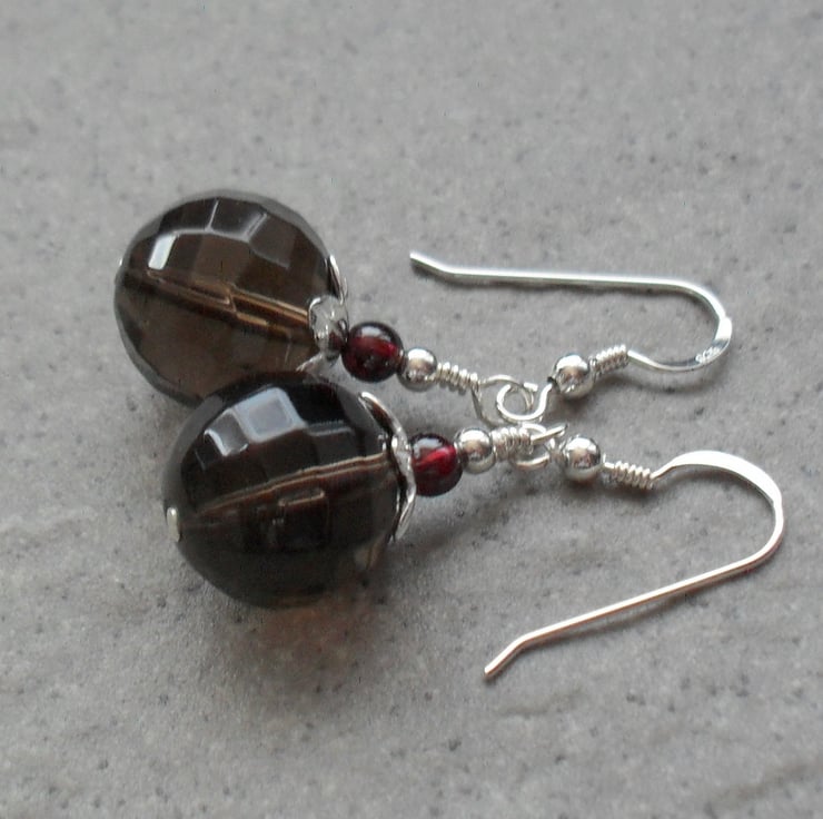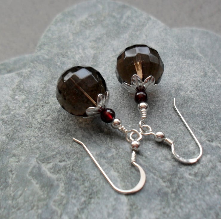 Smokey quartz and small garnet semi precious gemstones and sterling silver beads are attached to sterling silver ear wires