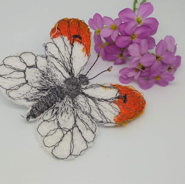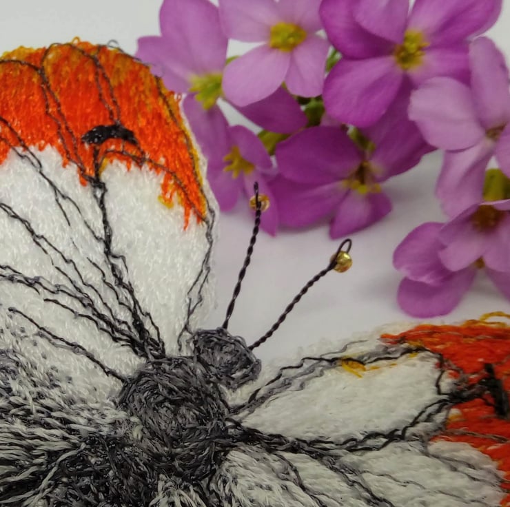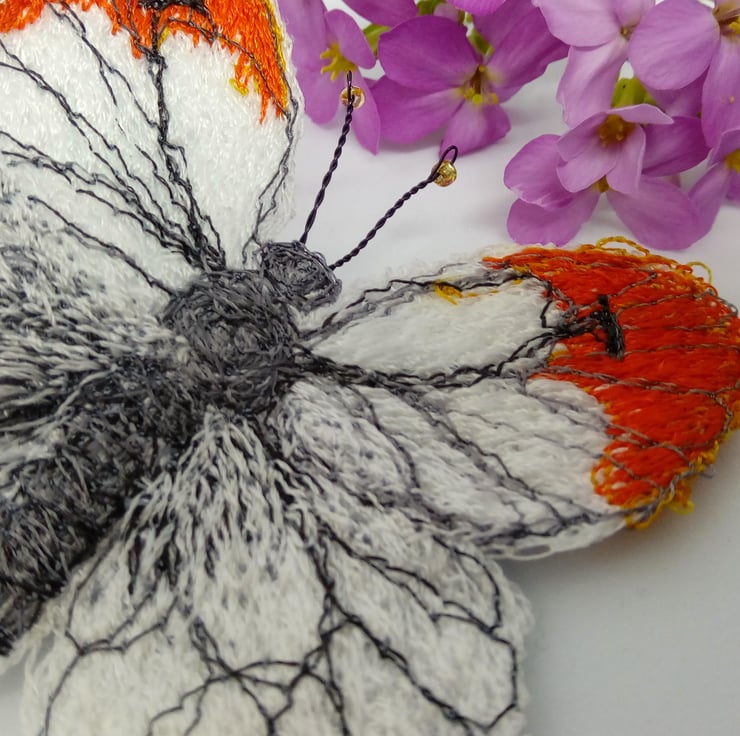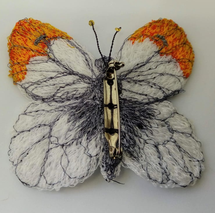 I love watching the beautiful Orange Tip Butterflies floating around my garden and out in the countryside. My butterfly brooches are made almost completely of thread: I ‘draw’ onto water-soluble fabric with my sewing machine, creating an interlocking network of thousands of stitches, choosing my colours to best capture the spirit of the butterfly. The fabric is then washed away leaving a delicate looking but surprisingly tough thread butterfly. I add wire and bead antennae and a brooch back to complete my piece. Each piece I make is unique and created with care and love.