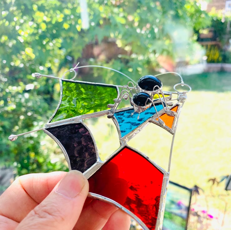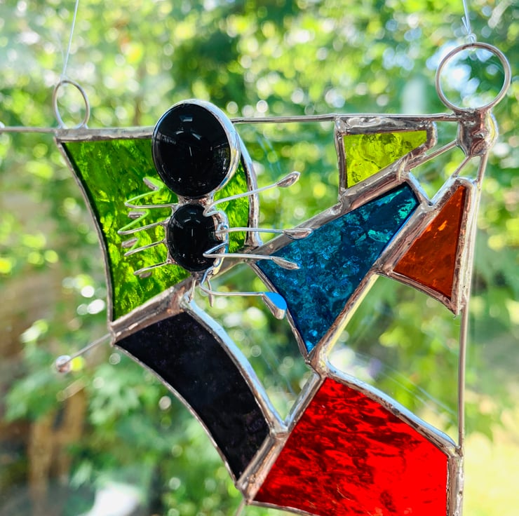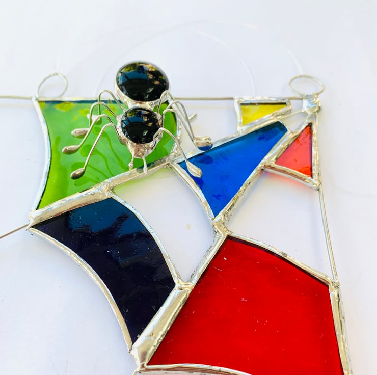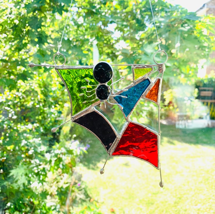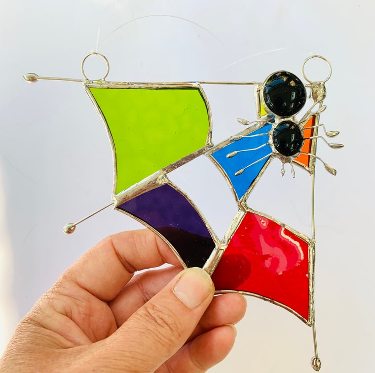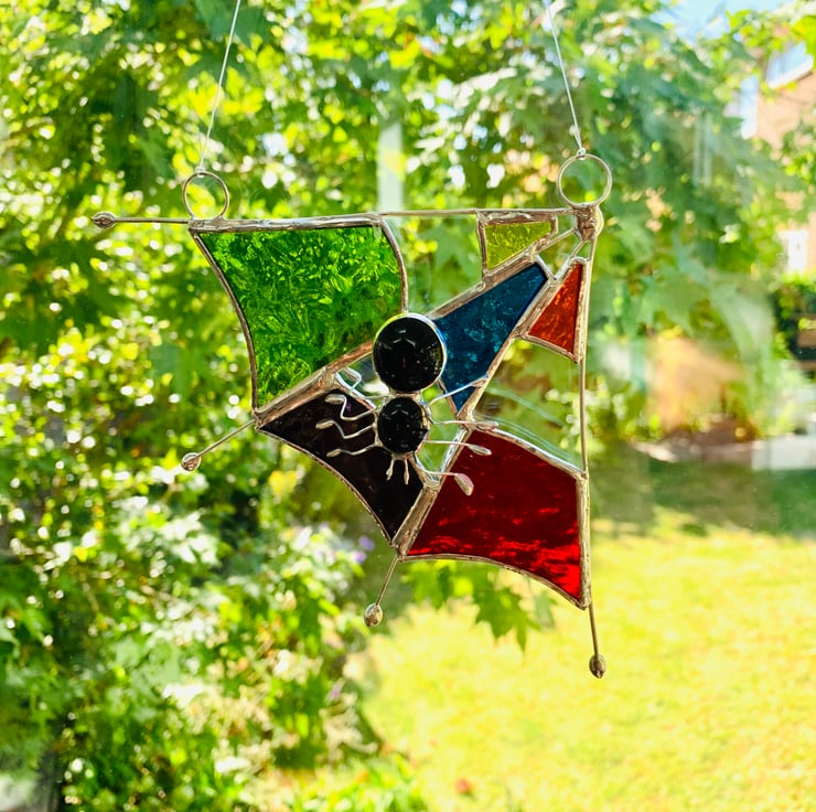 Each piece of glass has been hand cut, ground and foiled before being soldered together and washed. The web has been made from tinned copper wire and the spider from black glass nuggets and bent wire for the legs. A hook has been attached to the back so you can hook the spider where you like.