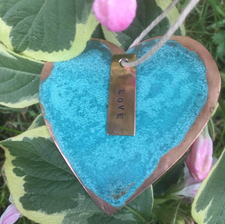 Hand sawn copper decoration which has been given a verdigris finish. These charming decorations are lacquered to maintain the patina, and come with a salutation tag for that little extra. Each decoration is between 7 -10 cm.