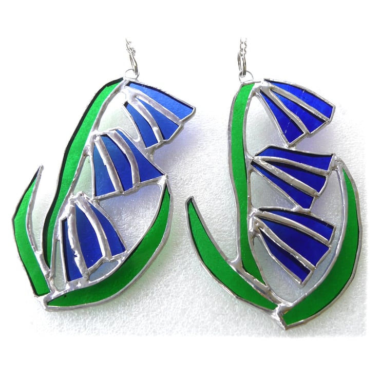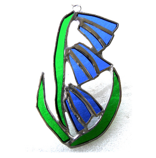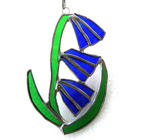 It is a simple floral design, of a beautiful bright blue flower with green strappy leaves. The three blue bells are made from a prettily streaked blue glass.