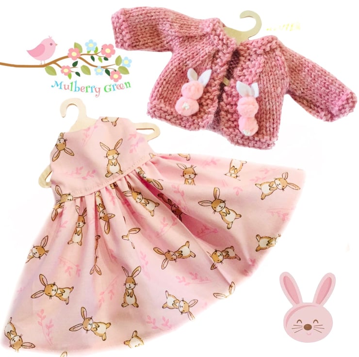 A cute little pink bunnies print dress to fit the Mulberry Green dolls. The dress is made from best quality designer cotton. It has a lined bodice, a gathered skirt and comes on a cute little wooden hanger. It matches the pink bunnies cardigan.