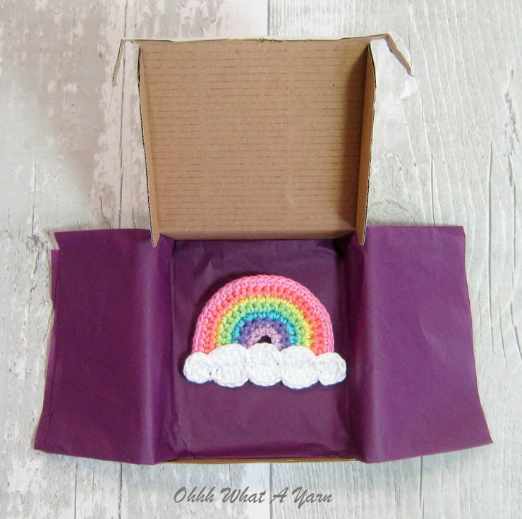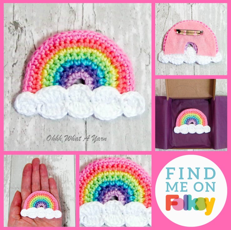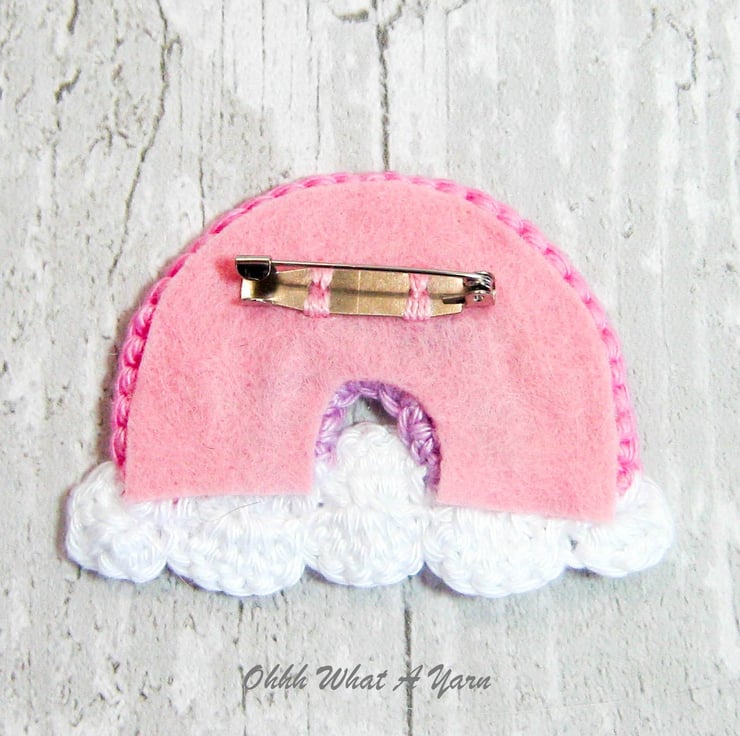 The rainbow has white fluffy clouds and is backed with pink felt. It has a standard brooch back and is hand washable in cool water, dry flat and reshape while damp if necessary.
