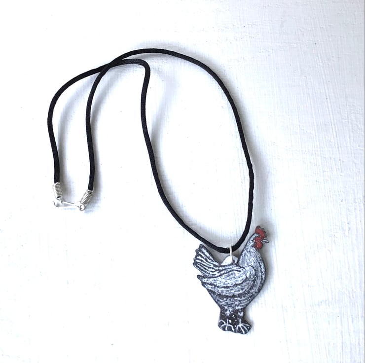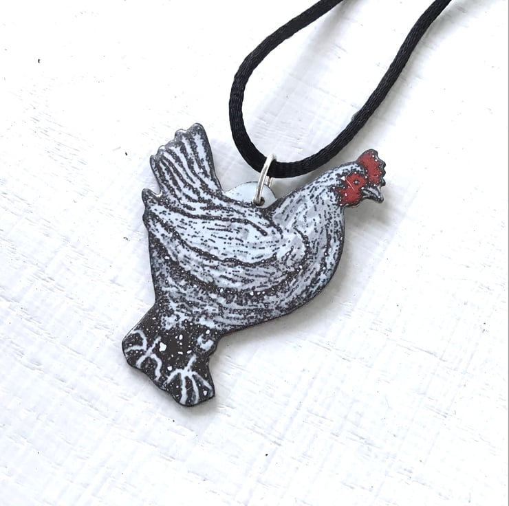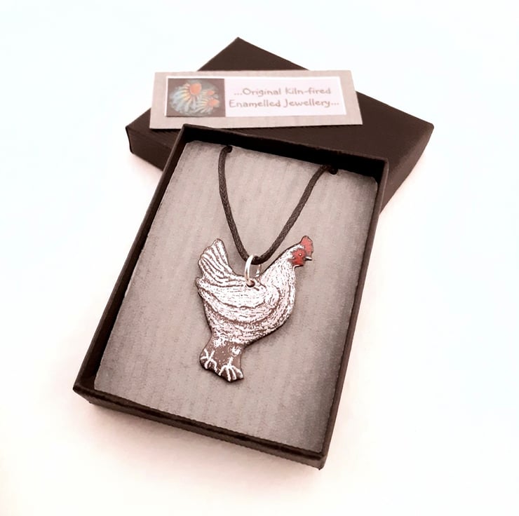 I hand cut this fun copper chicken shape and enamel it on both sides, in a process which involves several layers of enamel on each side with firings in between. The plumage and the bird’s features are applied as the final layer. The enamel on the reverse gives the pendant both strength and durability. The chicken pendant measures approximately 50mm high by 40mm wide and hangs from a black necklace cord with a silver-plated fastener, which I offer in a choice of lengths. It is presented in a quality card gift box and sent by Royal Mail 'Signed For' delivery in a cardboard postal box for protection.